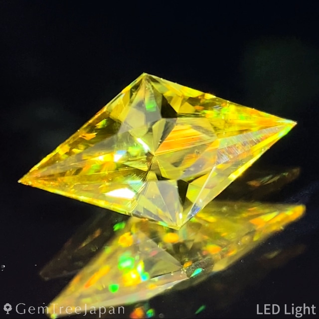 ↓グリーンジルコンについての記事 https://gemtreejapan.base.shop/blog/2025/11/08/145642 イエローイッシュグリーンジルコン 1.113ct 5.39×7.89×3.08mm スリランカ産 ペアシェイプ / キューブカット ピアッ / プッ / テン作品 ソーティング(簡易鑑別書)付き ¥64,800- 爽やかなイエローとグリーンが溶け合うように広がる、スリランカ産のイエローイッシュグリーンジルコン。 ペアシェイプに仕上げられたこの作品は、独自の「キューブカット」をクラウン側に施すことで、箱型のモチーフが光の反射に浮かび上がるユニークな煌めきを見せます。 箱の大きさに変化を加えた高難易度のカットデザインで、ジルコンの透明感と分散を最大限に引き出しています。 パビリオン側は端正なステップカットを組み合わせ、直線的な輝きとクラウンの遊び心あるカットが重なり合うことで、ジルコンらしいカラフルでシャープな煌めきが広がります。 厚みはやや抑えめですが、テーブルを設けないキューブカットによって抜け感を最小限に抑え、角度を変えるごとに奥行きのある光が立ち上がります。 内部には大きめの層状インクルージョンが2点ほど見られますが、半透明な結晶の質感と光の煌めきに紛れて肉眼では気にならず、むしろ天然石らしい個性を添えています。 全体にはほんのりとしたシルキーさが漂いながらも透明度は高く、ジルコン特有の高い分散度による虹色のファイアーもお楽しみいただけます。 グリーン系のジルコンは研磨が難しく、市場に数はあっても美しく研ぎ澄まされたものは希少です。 本作も長らくストックに眠っていた一石を、研磨専門カッターのプッちゃんとテンちゃんが久々にGTJの仕事に携わるタイミングで仕上げた特別な一石。 ペアシェイプに浮かぶ独創的なカットワークと、グリニッシュゴールドとも言えるカラーの美しさを、ぜひお手元でご堪能ください。