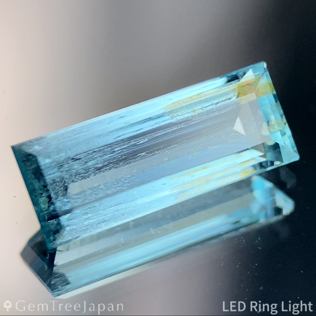 アクアマリン 2.091ct 5.11×12.91×3.62mm ナイジェリア産 バゲット ピアッちゃん作品 ソーティング(簡易鑑別書)付き グリーンを帯びたマリンブルーが印象的な、ナイジェリア産アクアマリン。 端正なバゲットシェイプに仕上げられた本作は、直線的なステップカットが透明感を際立たせ、凛とした清涼感を放ちます。 この一石の特徴は、結晶の約半分にかけて広がる層状のインクルージョン。 角度を変えるたびにシュワシュワとラメ感を伴った煌めきを見せ、まるで水面に光が揺らめくような幻想的な景色を描きます。 また端にオレンジ色のインクルージョンが入り、鉱物感を感じさせるアクセントを与えています。 やや薄めのプロポーションのため中央には軽い抜け感がありますが、視点によっては直線的な光がスッと走り抜け、バゲットカットならではのモダンで端正な輝きが楽しめます。 2ctアップの存在感に加え、個性豊かなインクルージョンが「海の物語」を語るかのような特別な一石です。 清涼なブルーと自然が描き出した景色を兼ね備えた、唯一無二のアクアマリンをぜひお手元でご堪能ください。