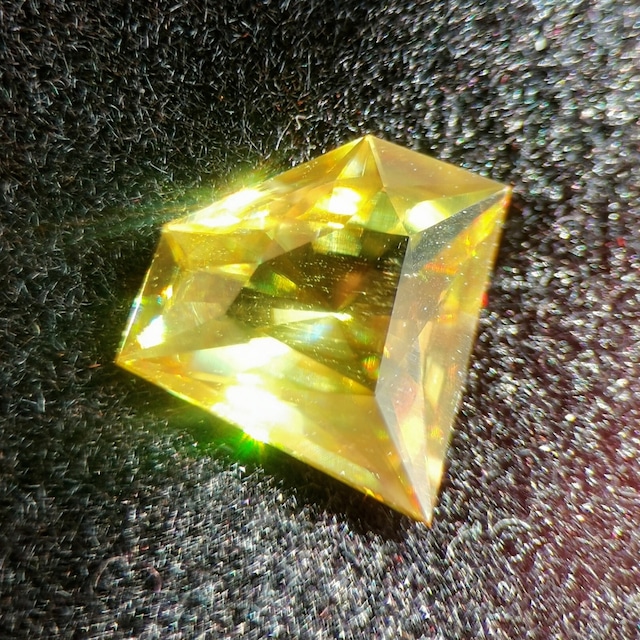 スフェーン 0.94ct 7.3×4.9×2.7mm マダガスカル産 キューブオクタゴン ピアッちゃん作品 ほんのりグリニッシュなゴールドのマダガスカル産スフェーンで、ステップカットのオクタゴンシェイプに仕上げ、テーブル周りに立体的なカタチが浮かぶGTJオリジナルのキューブカットに仕上げた作品です。 ステップカットによる直線的なゴールドの煌めきに加えて、虹色のファイアーの煌めきに溢れて非常に美しいです。 場所によって成長線が入っていますが、肉眼で目立った内包物のない美結晶で、美しいカットと研磨を施すことでスフェーンの高い分散度を最大限に引き出しました。 シンプルでありながらさりげないオリジナリティもあり、スフェーンの美しさをご堪能いただける一石をぜひお手元でお楽しみください。