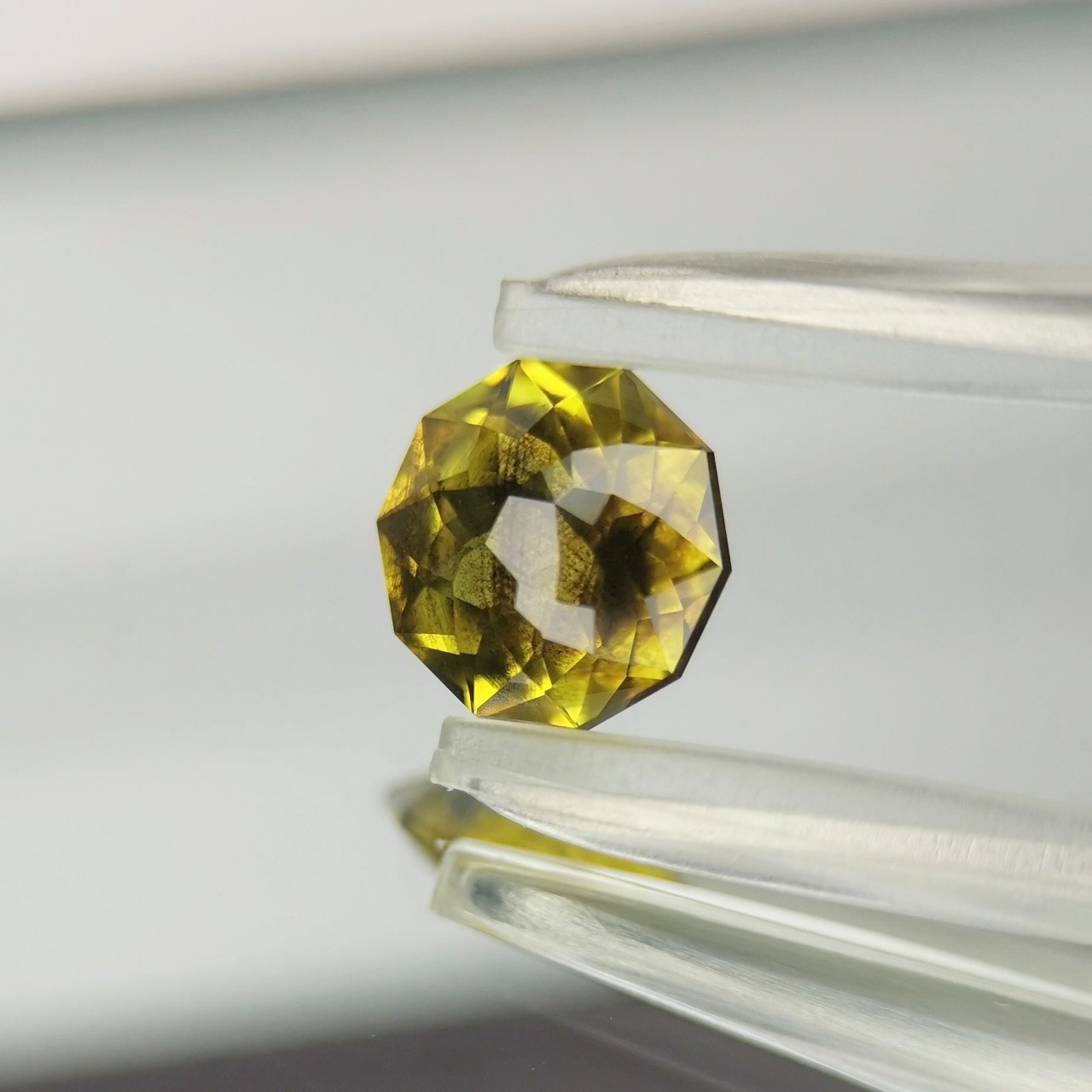 ひまわりのようなほんのりグリニッシュなイエローの結晶に、角度によって金色に光るブラウンのシルクインクルージョンの入ったナイジェリア産の非加熱サファイアで、テーブルを小さくしてフラワーカットを敷き詰めた輪郭を縁取った10角形ファンシーラウンドに仕上げた作品です。