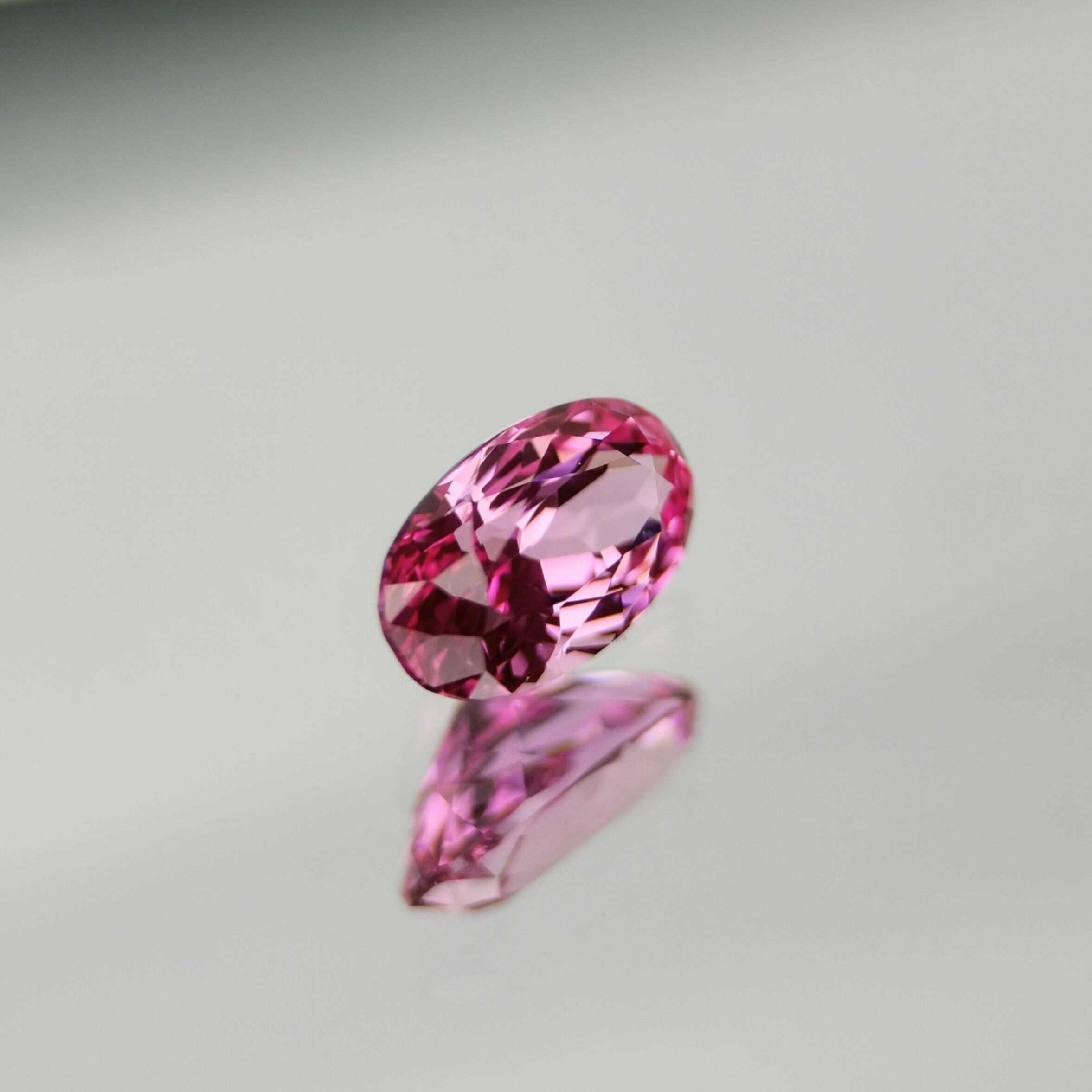 両端に強いネオンピンクの色だまりがあって、パパラチァカラーのオレンジーピンクの煌めきとラベンダーピンクの煌めきが溢れる、極めてピンク寄りの非加熱パパラチァサファイアで、原石からロングオーバルに仕上げた作品です。