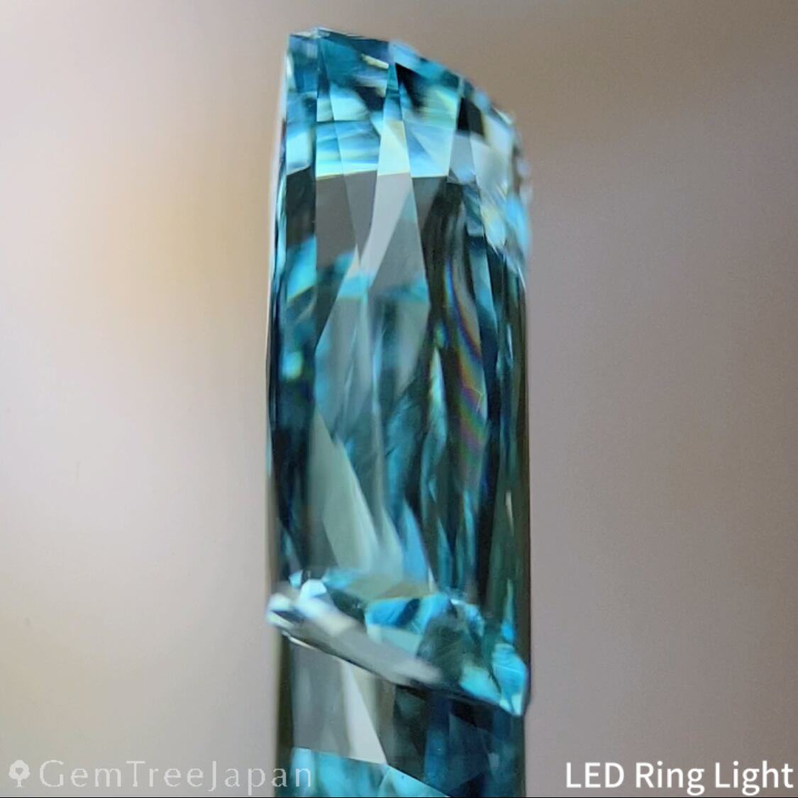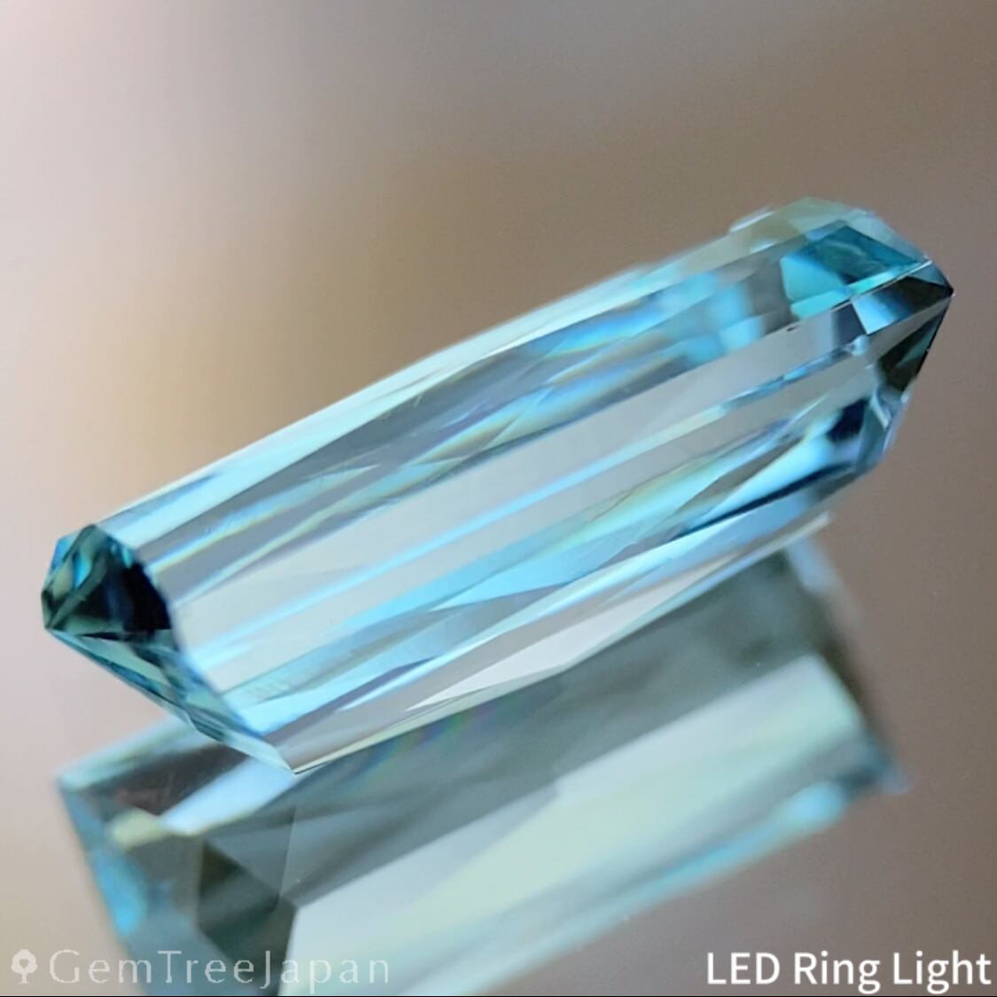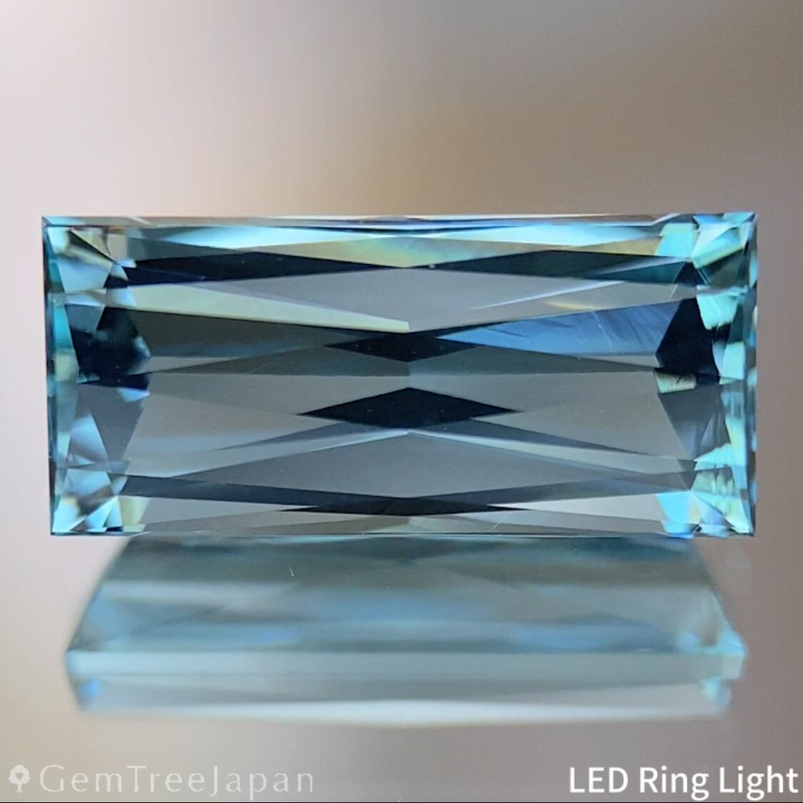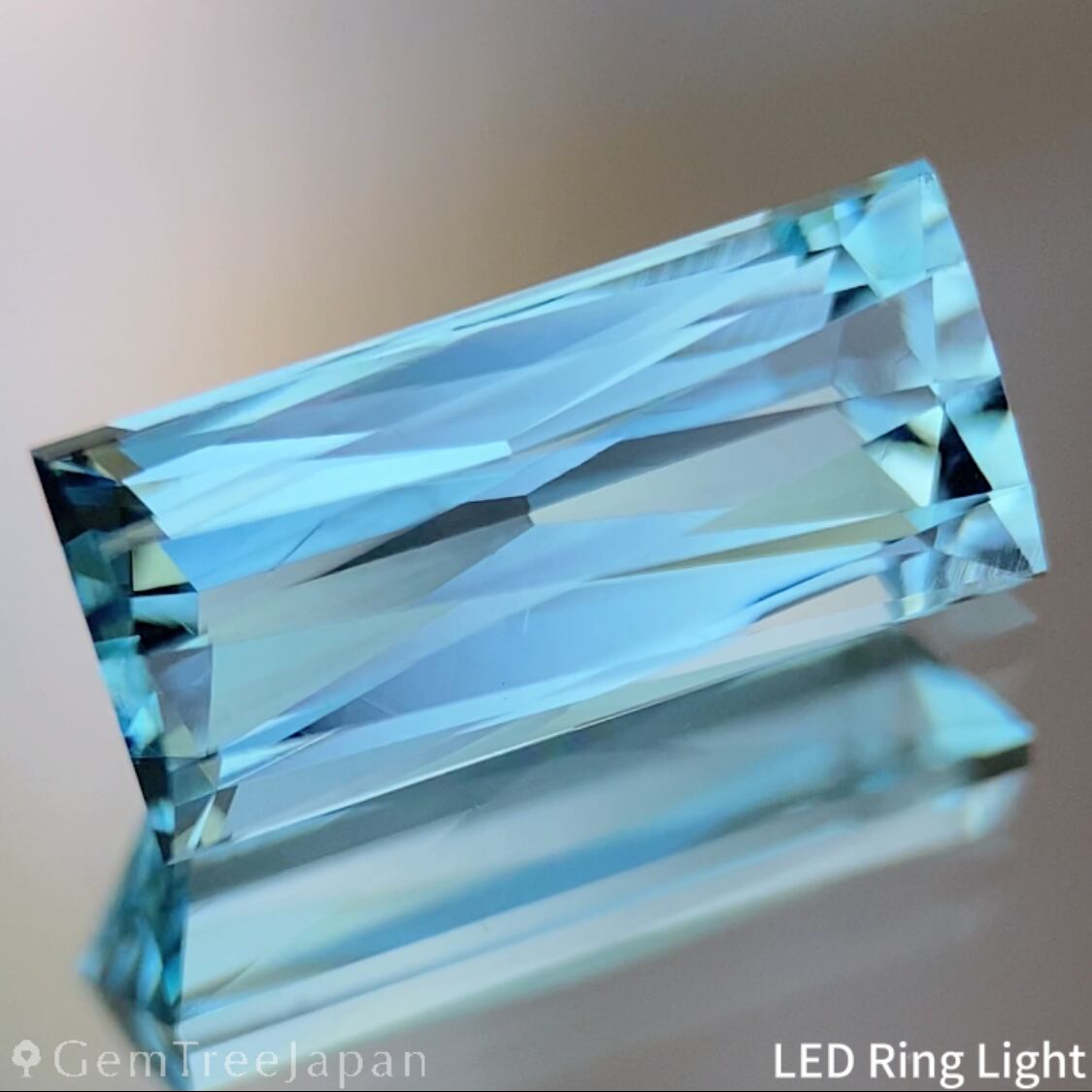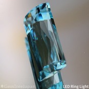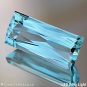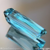 色のりの良いマリンブルーのナイジェリア産アクアマリンで、バゲットシェイプの両面にシザースカットを施した作品です。