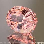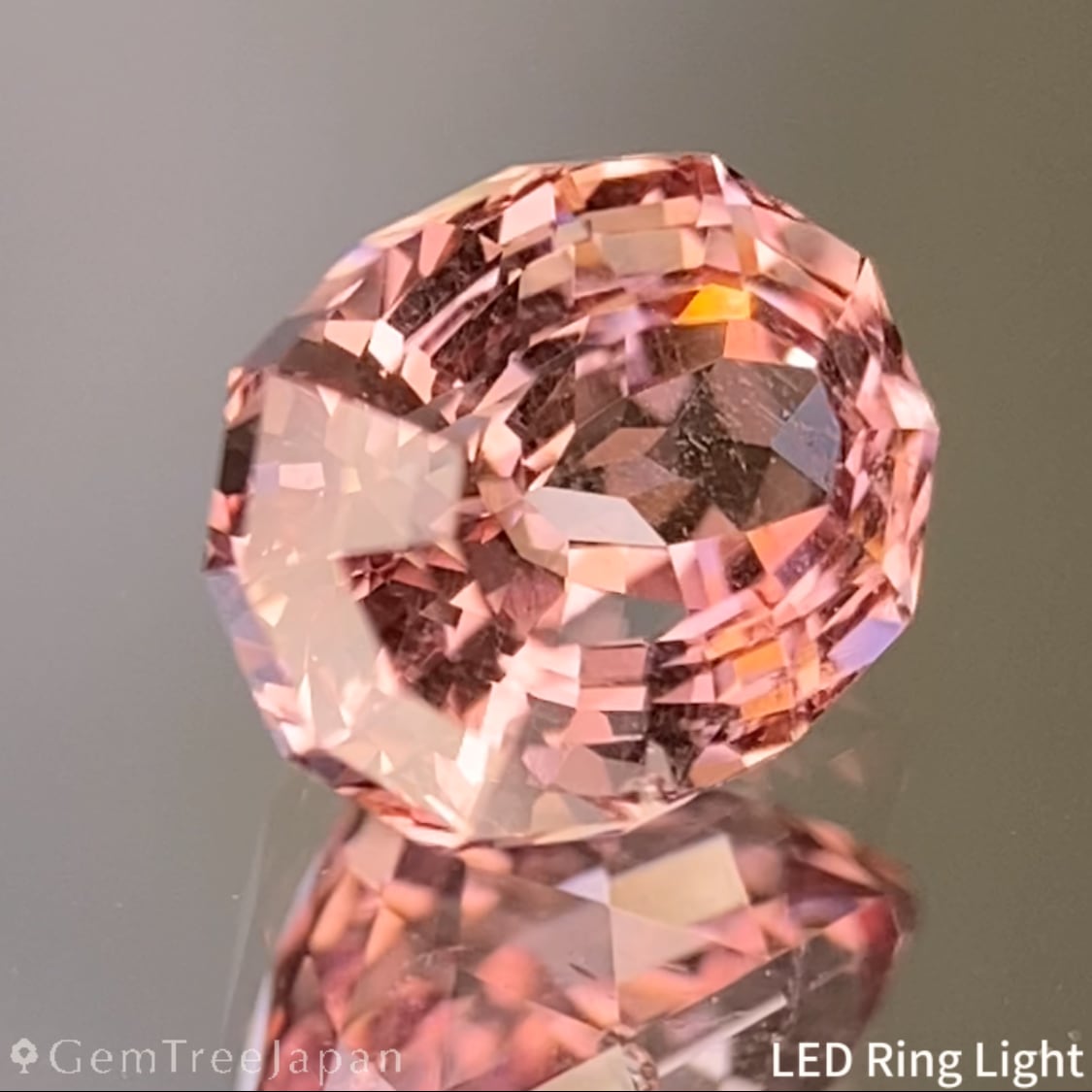 品の良いオレンジーピンクのマラヤガーネットで、原石から輪郭を細かく縁取ったファンシーオーバルに仕上げ、パビリオン側をフラワーカットに、クラウン側をステップカットにした新カット作品です。