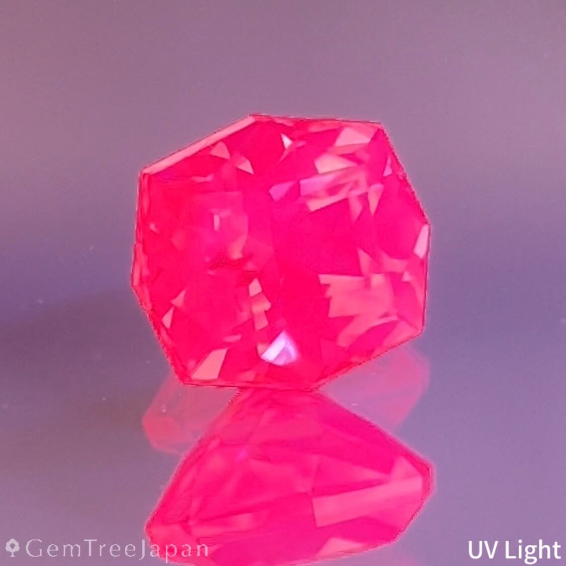 ほんのりシルキーなパープルのベールがかかった濃厚なオレンジーピンクのベトナム北部・ルックイェン産の非加熱サファイアで、8角形のファンシークッションに仕上げテーブル周りに宝石のカタチが浮かぶGTJオリジナルのZBカットを施した作品です。