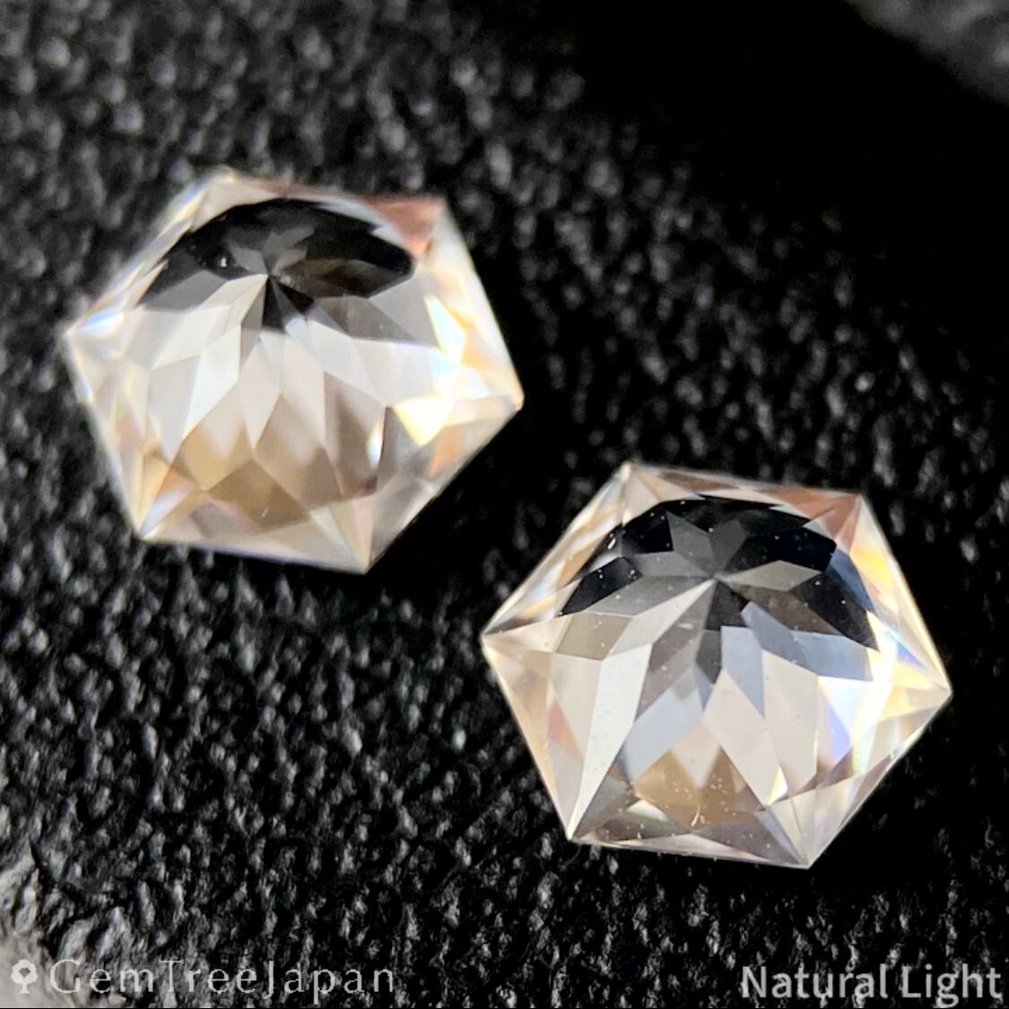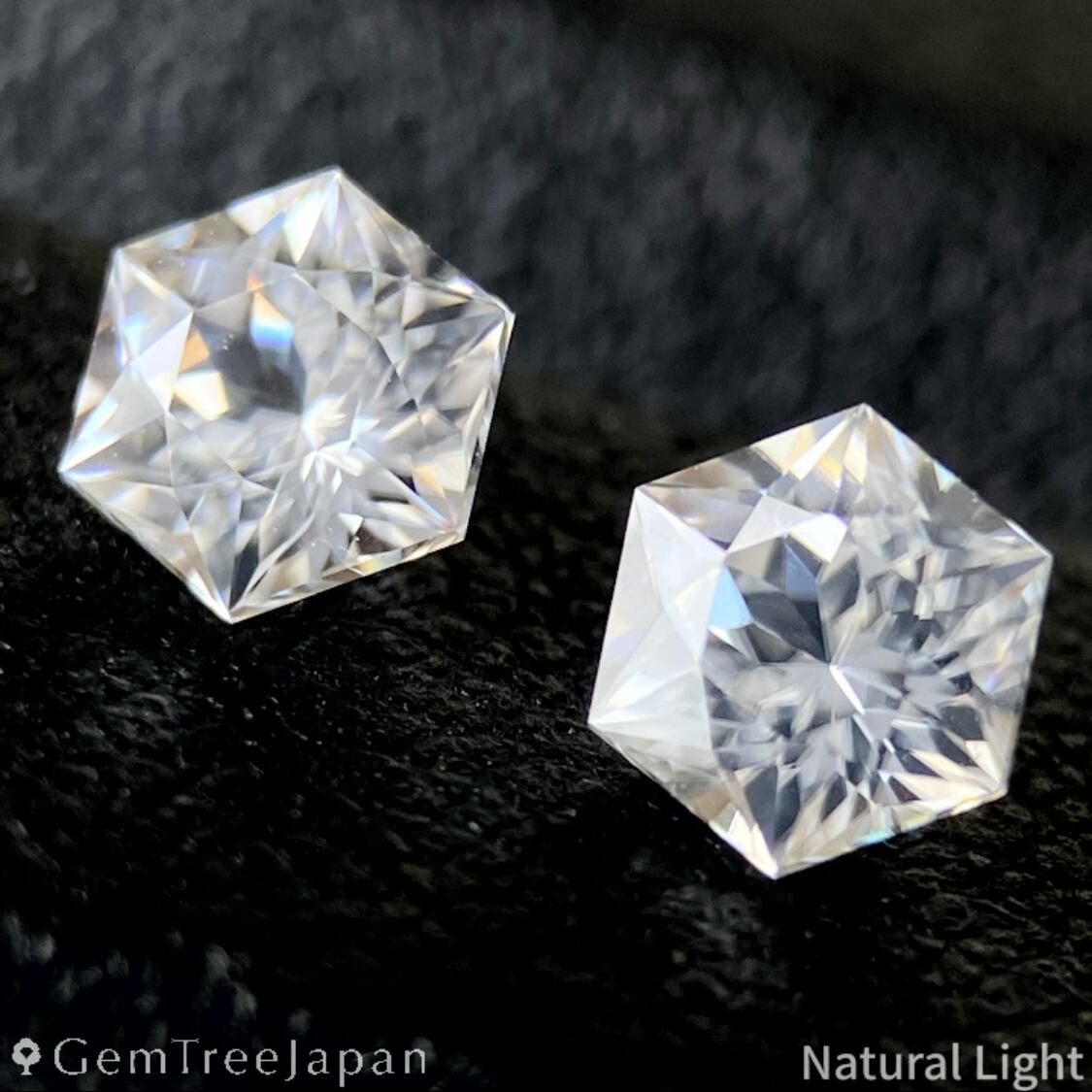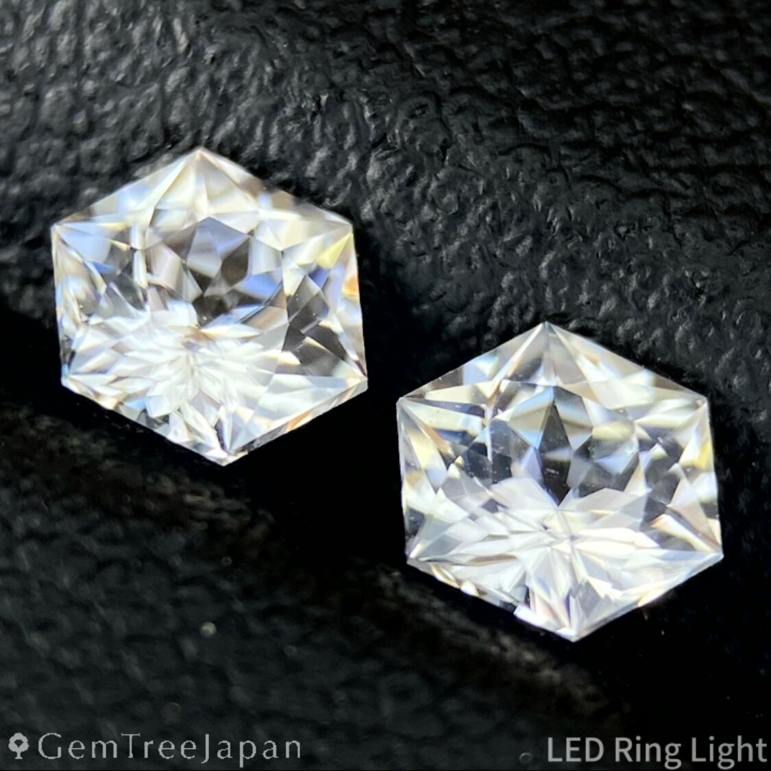 純白でクリアなカラーレスジルコンで、フラワーカットの6角形のシェイプに仕上げた作品です。