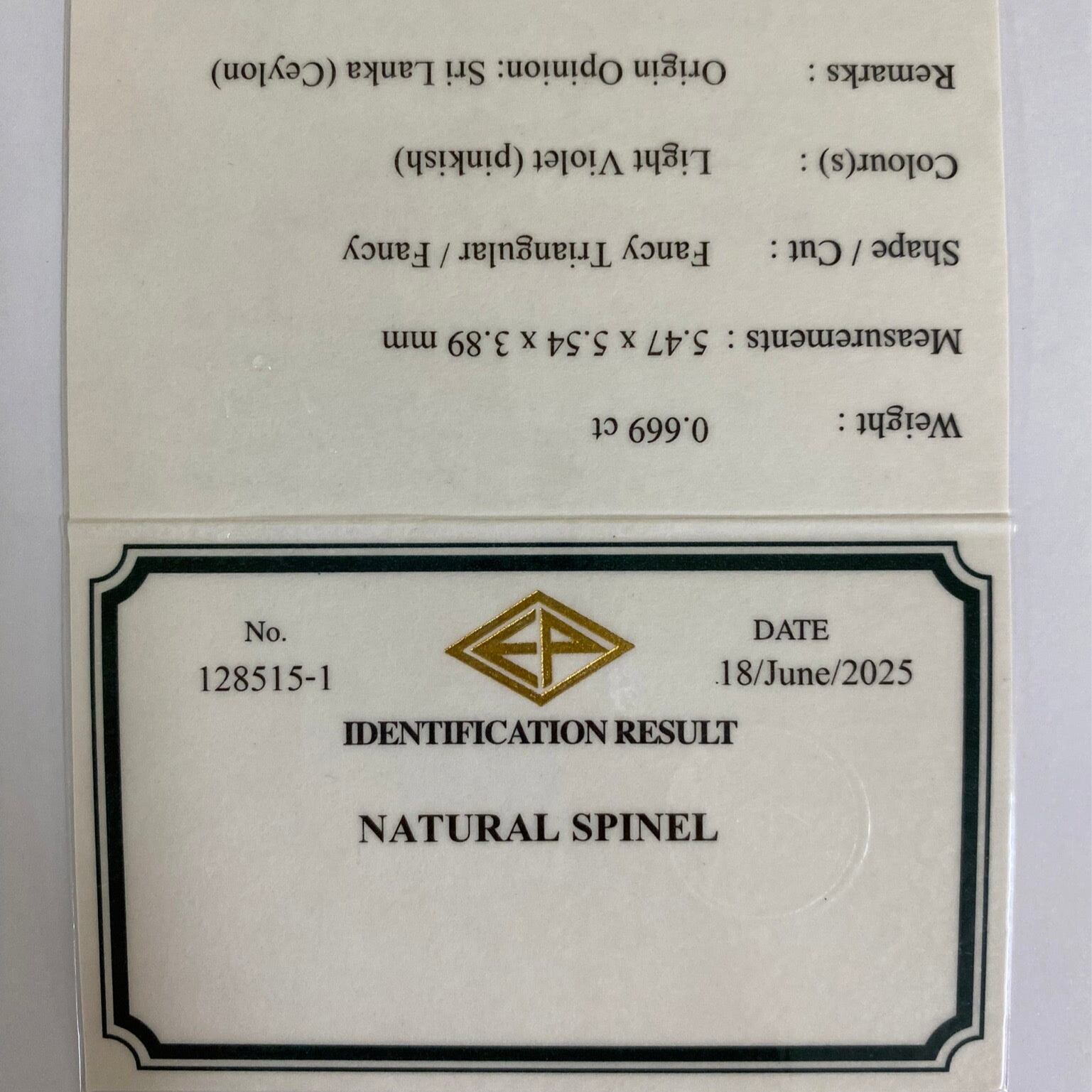 深みのある地色からピンクと明るいヴァイオレットが混ざり合うラベンダーカラーのスリランカ産スピネルで、輪郭を6角形のファンシートリリアントに仕上げた作品です。