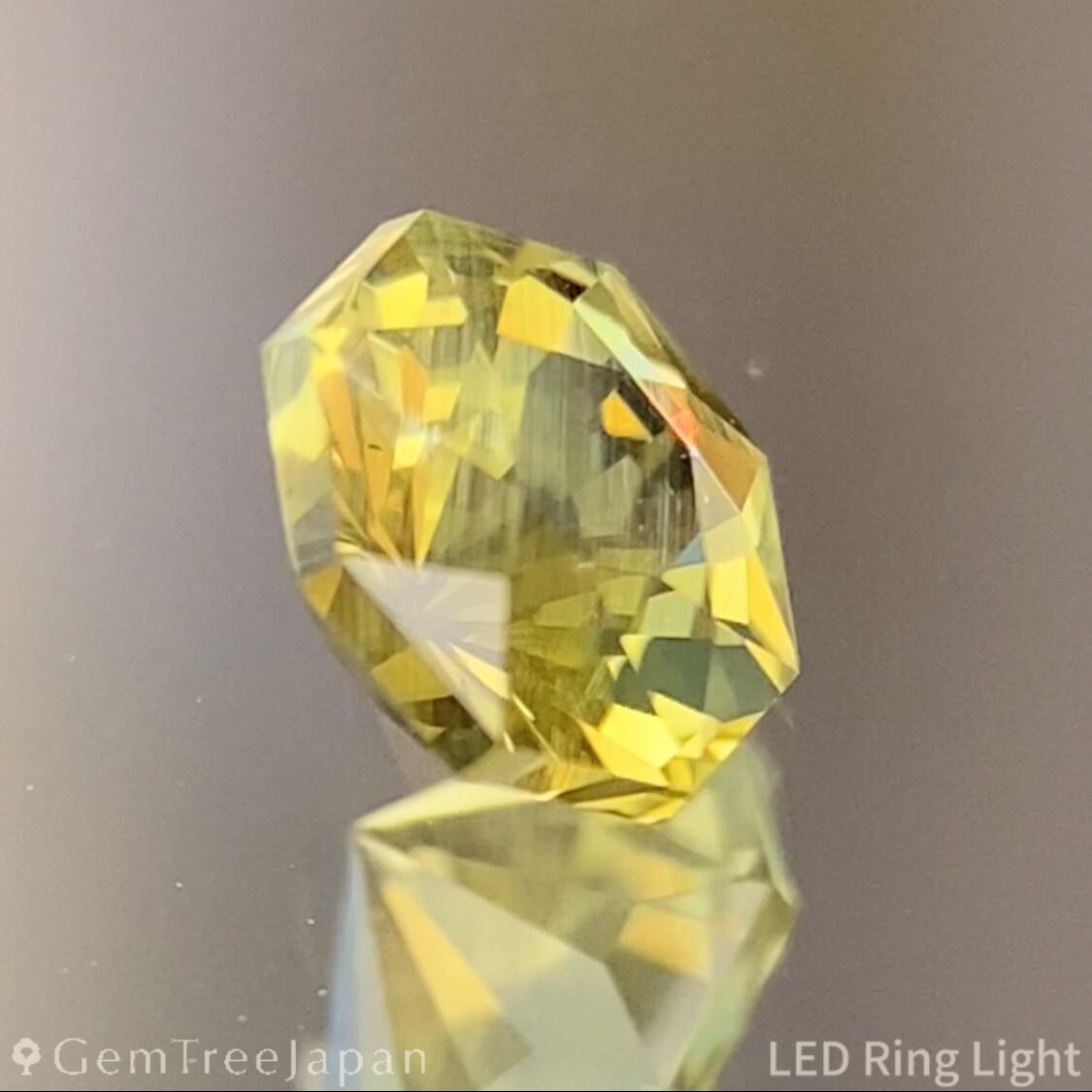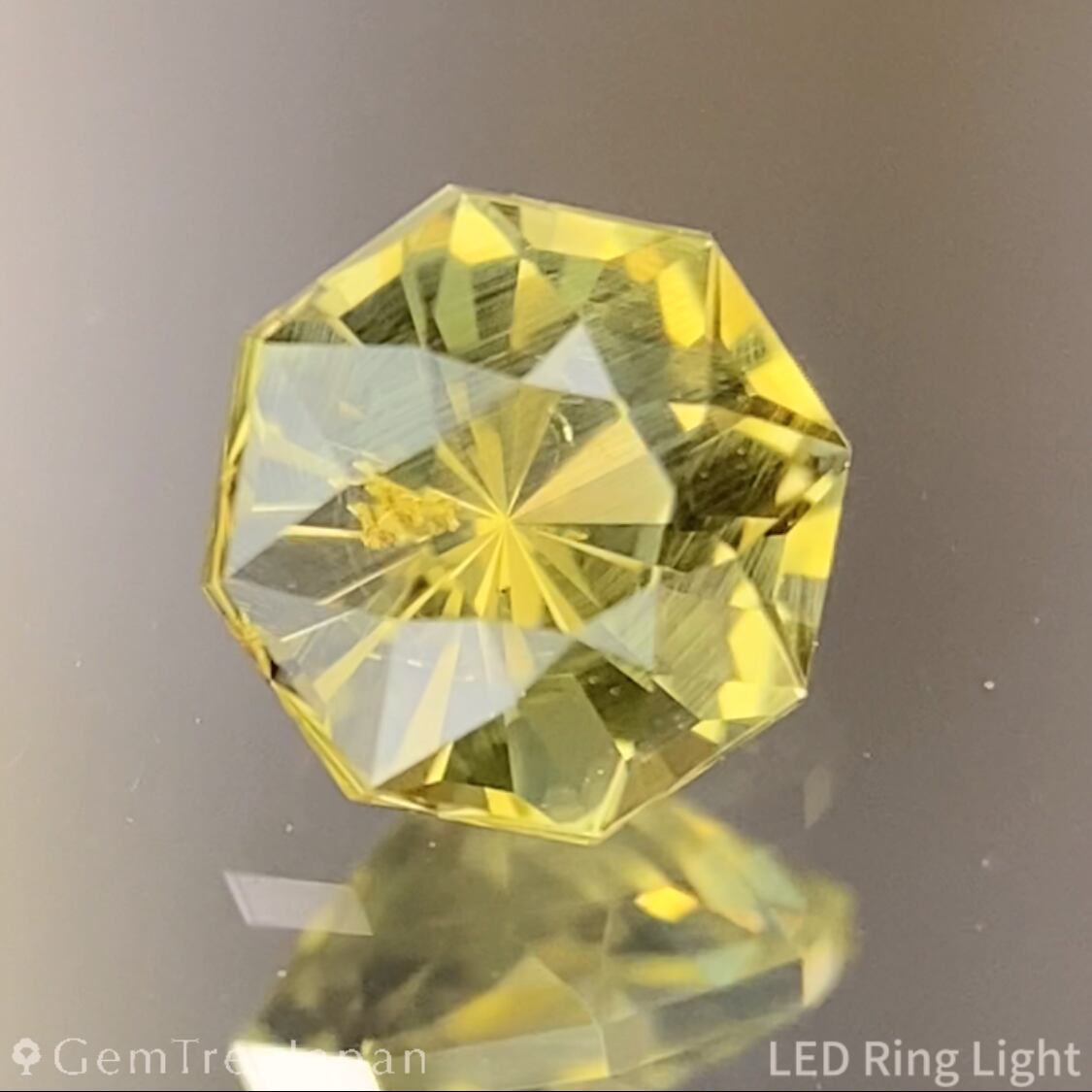 ほんのりグリーンを噛んだイエローのスリランカ産クリソベリルで、正八角形のファンシーラウンドで仕上げた作品です。