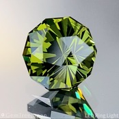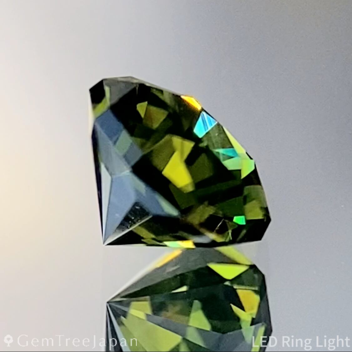 深みのある地色からのオリーブグリーンの明るく鋭い煌めきを放つスリランカ産グリーンジルコンで、タイ語で時計を意味するナリカーカットを施した10角形ファンシーラウンドに仕上げた作品です。