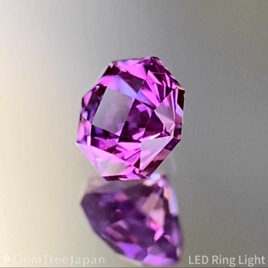 濃厚なパープリッシュピンクのスリランカ産サファイアで、正八角形のファンシーラウンドに仕上げた作品です。