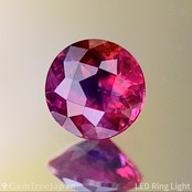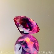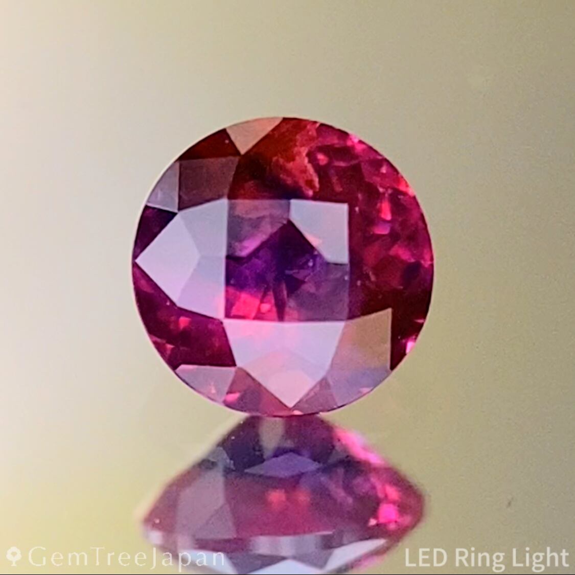 ネオンピンクをベースに、シルキーブルーの層とパビリオン側に見られるオレンジの皮膜インクルージョンが重なり合う、色の奥行きが楽しめる非加熱ルビー。