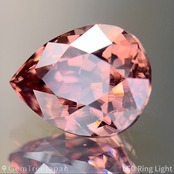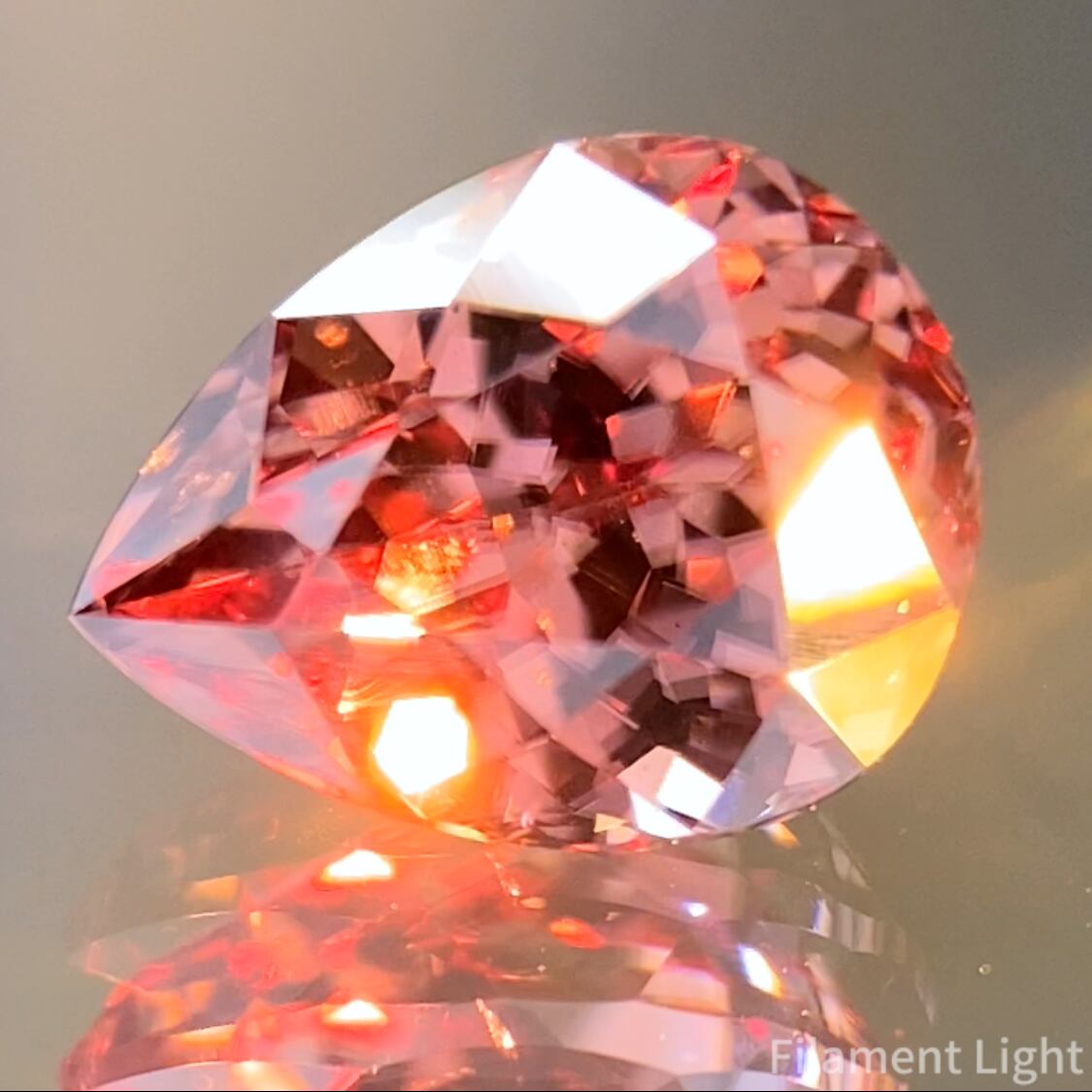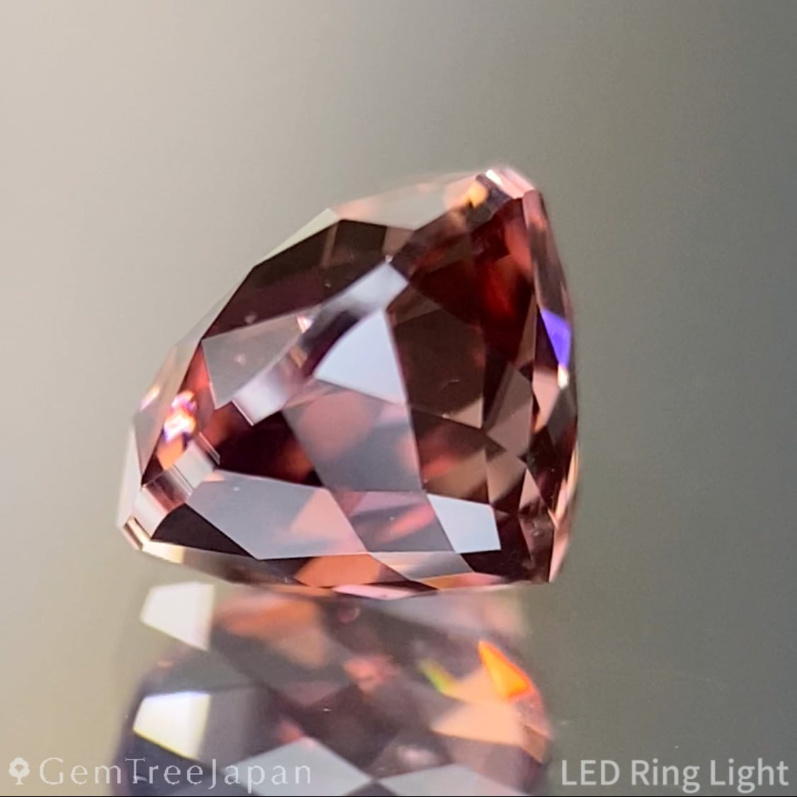 ピンキッシュオレンジにパープルが重なるような、幻想的な煌めきを放つ一石です。ジルコン特有の強いダブリングが石全体に広がり、見る角度によってカラフルなファイア(虹色のきらめき)がチラつきます。