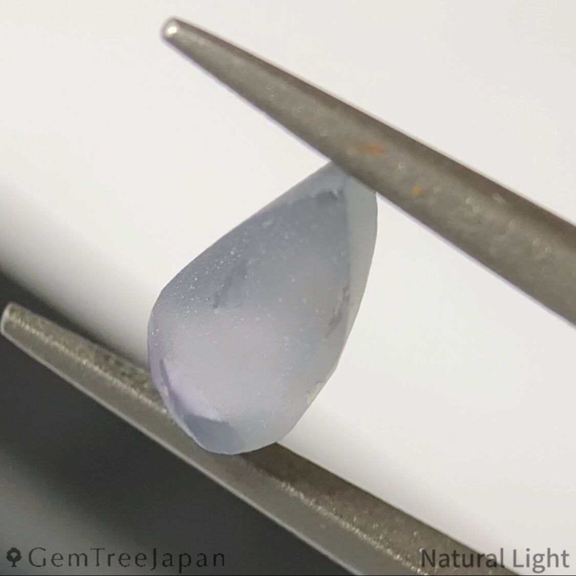 全体にグレーイッシュでほんのりシルキーな、ライラックカラーとグリーンが混ざり合った不思議な色合いのマダガスカル産サファイアで、ロングペアシェイプに仕上げた作品です。