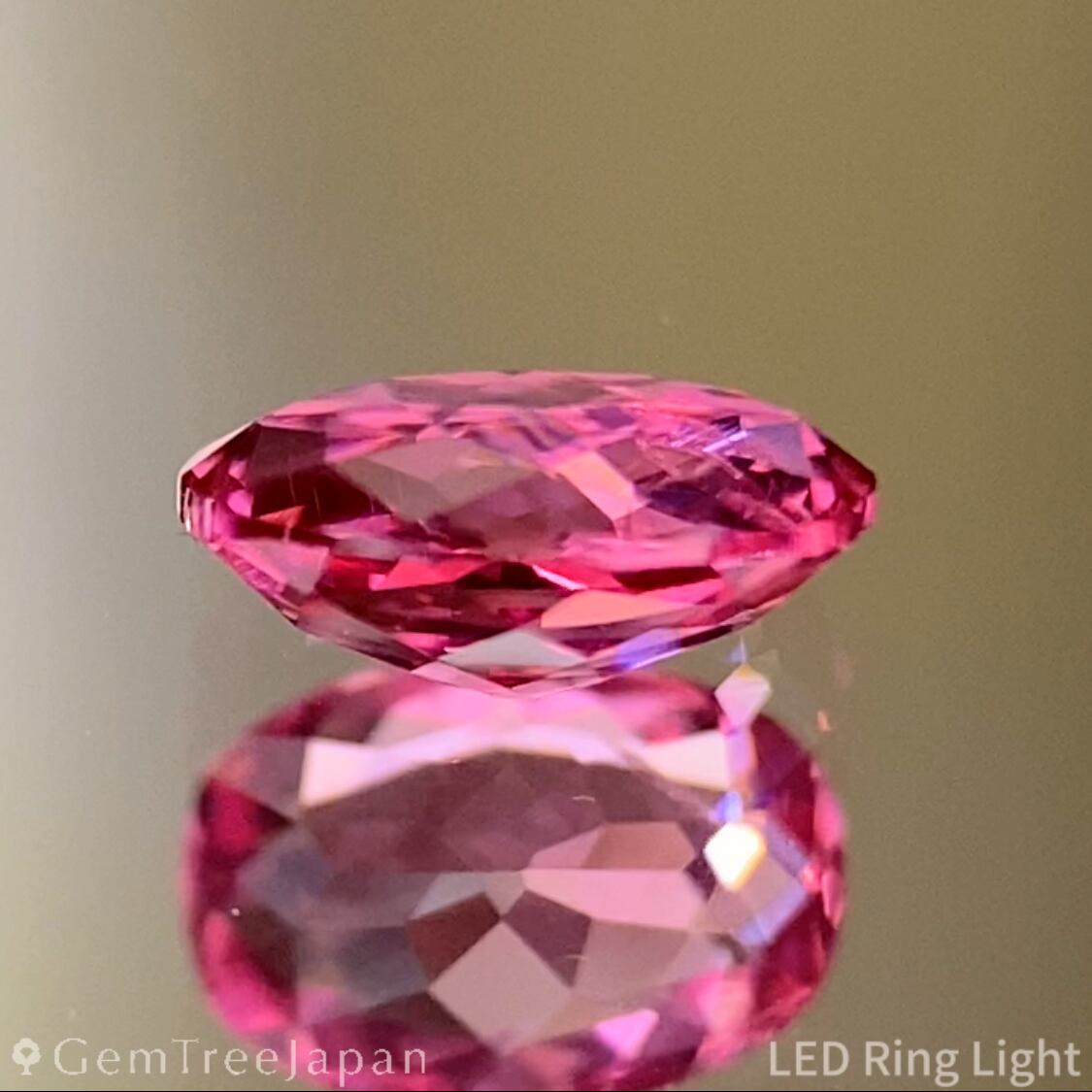 タンザニア・マヘンゲ産らしい、ネオン感のあるピンクにオレンジがほのかに溶け込むような華やかな発色。シェイプはオーバルとクッションの中間のような柔らかな印象に仕上がっており、両面に施されたフラワーカットが光を捉えて細やかな煌めきを全体に散らします。