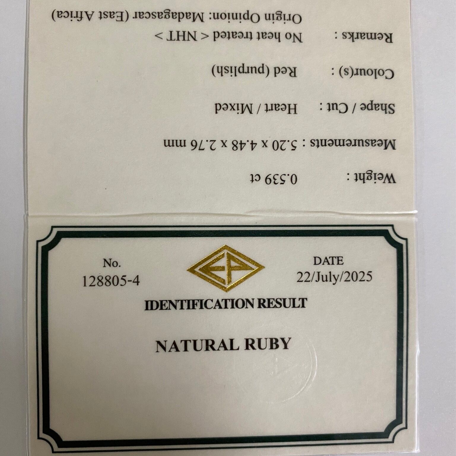 ルビーとしては非常に珍しく、目立った内包物のない超美結晶。その上、0.5ctを超える非加熱という組み合わせは、希少性・美しさともに高く評価される価値ある一石です。