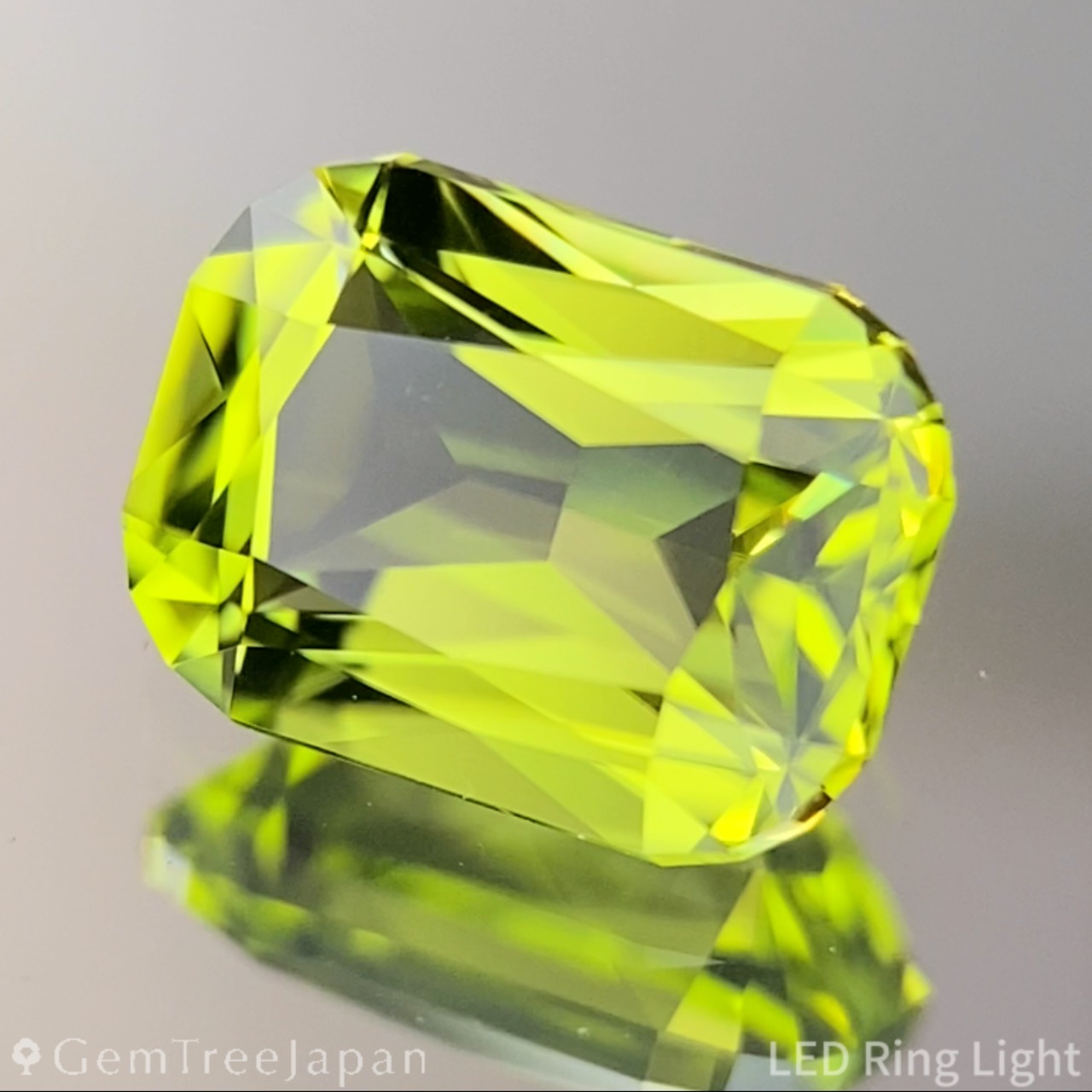 発色鮮やかなイエローイッシュグリーンが印象的な、アメリカ産のペリドット。オクタゴンとクッションの中間のような輪郭に、三段の角の縁取りが特徴の「スーパーエレガントカット」で仕立てた作品です。