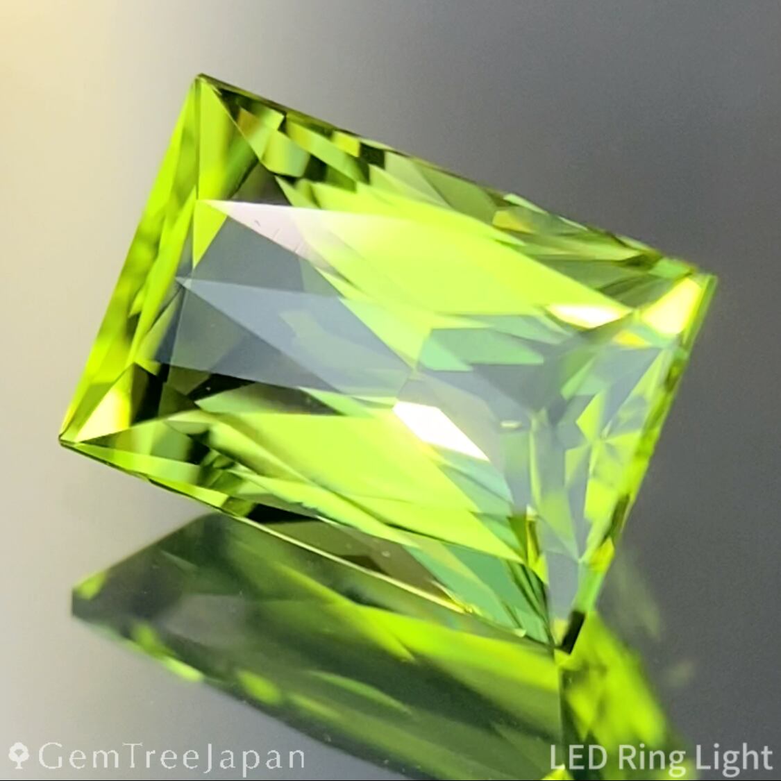鮮やかなイエローイッシュグリーンが美しく映える、アメリカ産ペリドットの超美結晶。バゲットシェイプをベースに、両面にシザース系のファセットを施したGemTreeJapanオリジナルの「あやとりカット」に仕立てた一石です。