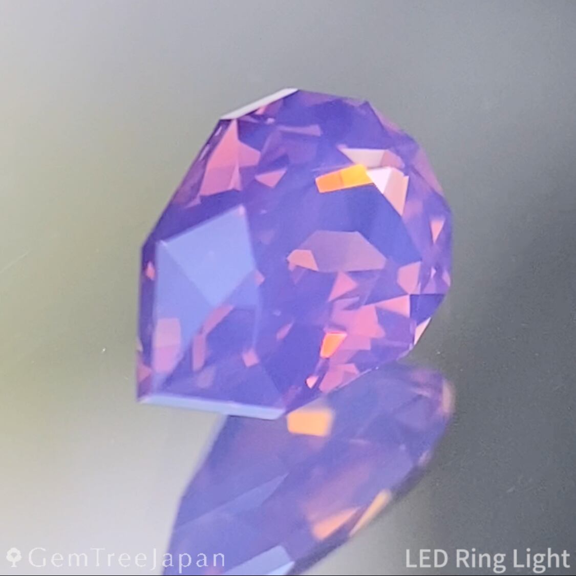 輪郭を細かく縁取ったファンシーペアシェイプに仕上げられ、クラウン・パビリオンともに繊細なフラワーカットが施されています。