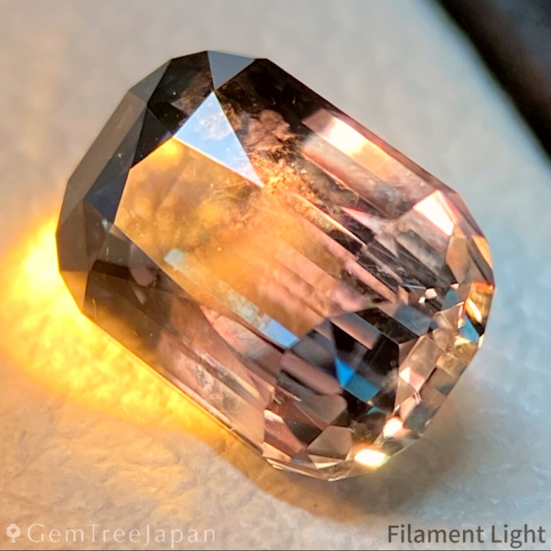フィラメントライトを当てると全体がパープリッシュピンクを帯び、パープル混じりのゴールドの煌めきを放ちながら、グリーンが引き、ブルーが際立つというユニークなカラーチェンジを見せます。