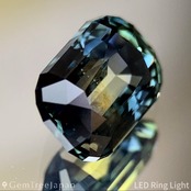 深みのある地色の中で、パビリオン側のステップカットとクラウン側のシザースカットが織りなす直線的で変化に富んだ煌めきが、ブルー・グリーン・イエローの色彩を混ぜ合わせるように輝きます。