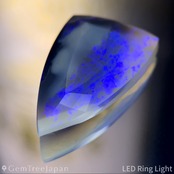14mm×21mmを超える堂々たるサイズにファセットを施したトリリアントシェイプで、見る角度によって幻想的に移ろうブルーの遊色と、乳白〜イエローの地色が織りなす景色を楽しめる一石です。