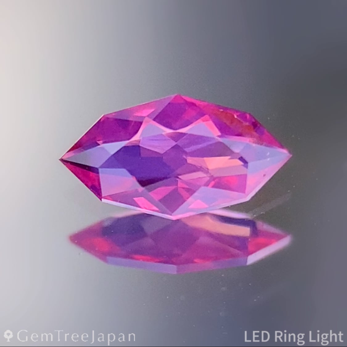 輪郭沿いに溜まった濃いピンクの部分からは、強いネオンピンクの煌めきが鋭く走り、角度を変えるごとに生き生きとした光の表情を見せます。