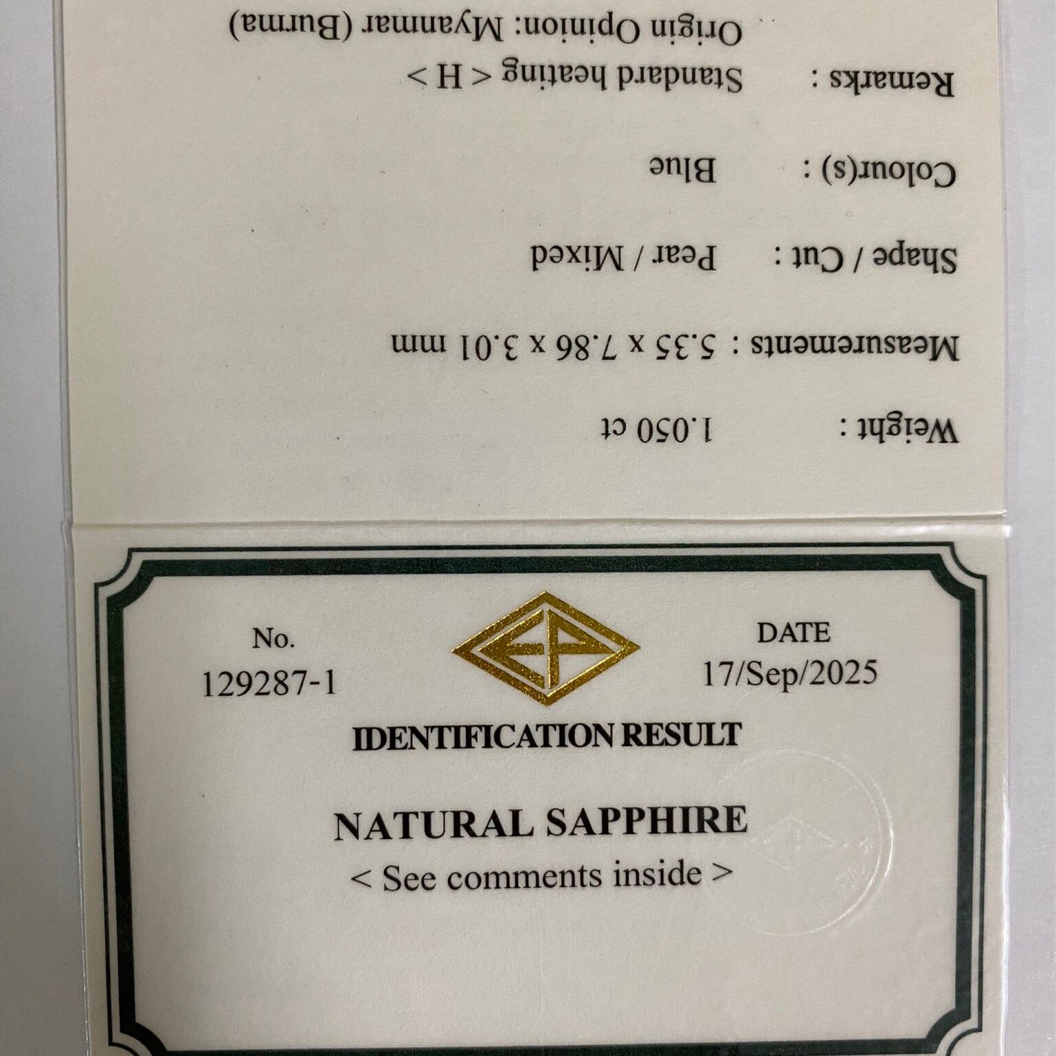 濃密なロイヤルブルーのカラーを堪能できる端正なペアシェイプに仕上げたビルマ産ロイヤルブルーサファイア。