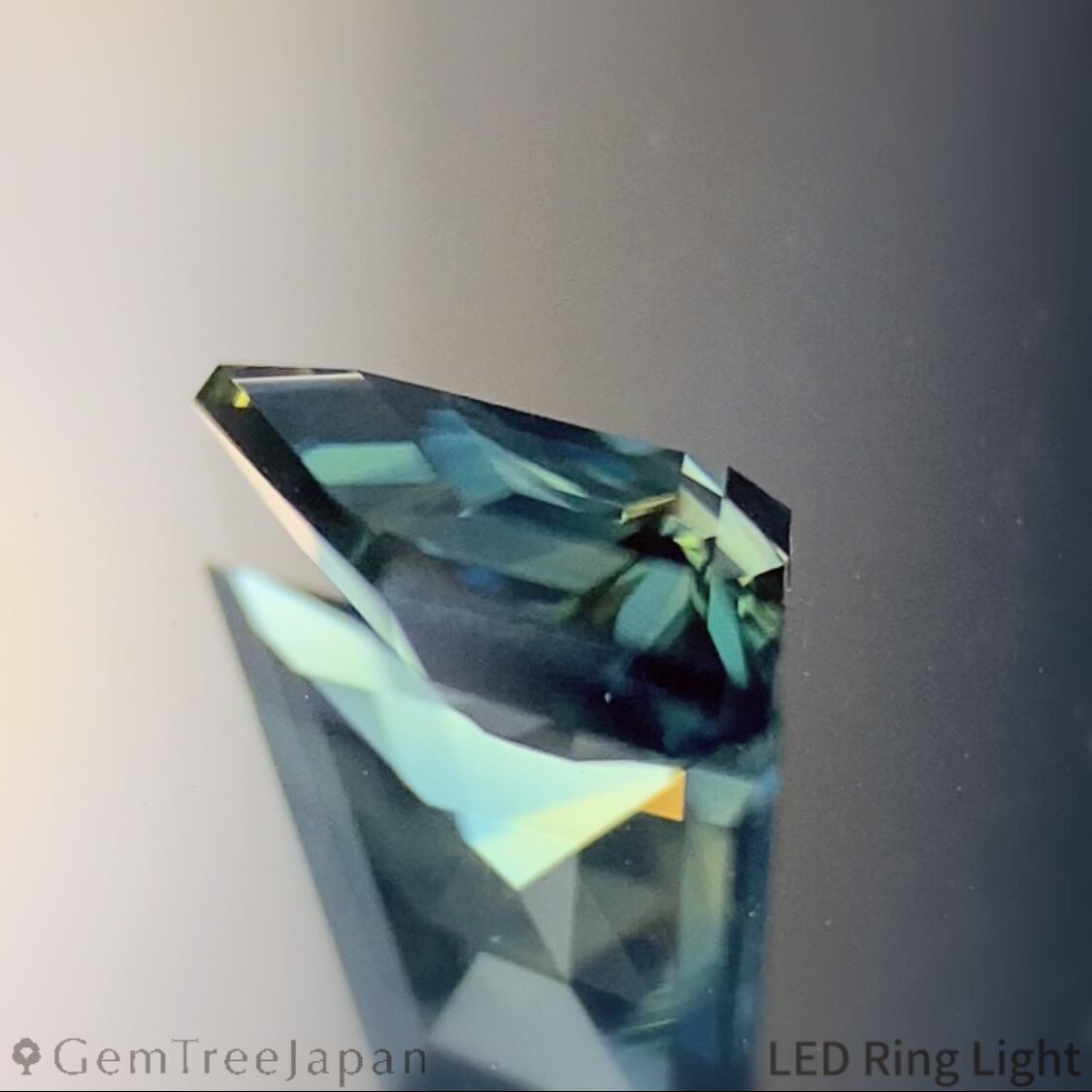 このサファイアの原石は非常にシャープで、落とすところのない色の面白さがあったので、アシンメトリーの原石の形にあわせたシェイプに仕上げました。