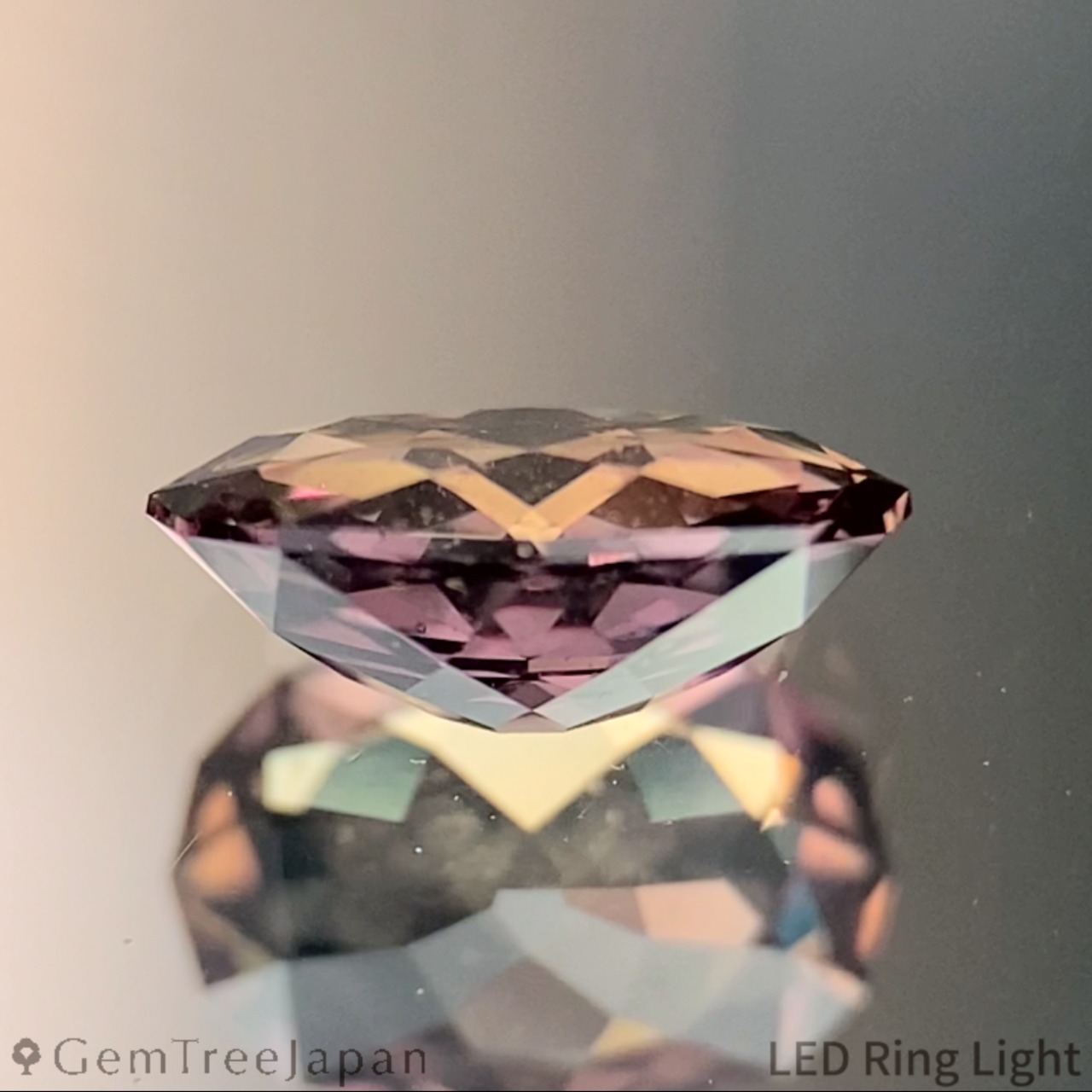 フィラメントライトを当てると赤みがグッと増します。煌めきに潜むグリーンの出方も含めて、カラーチェンジサファイアのような趣も持っています。