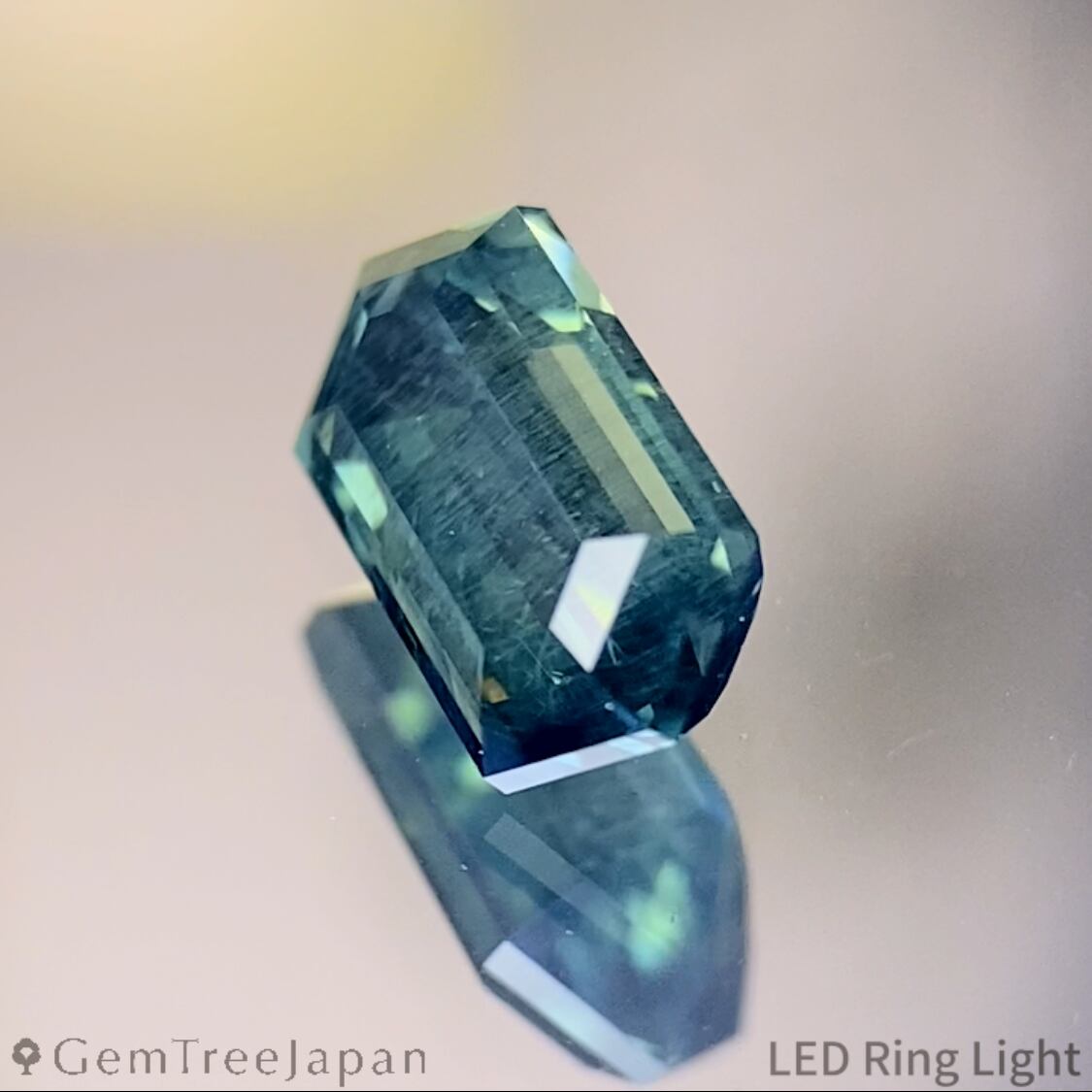 端正なヘキサゴンにステップカットが施され、面で輝くシャープな煌めきと両端に溜まる濃いグリーンが、すっきりとしたシェイプと相まってスタイリッシュな雰囲気です。