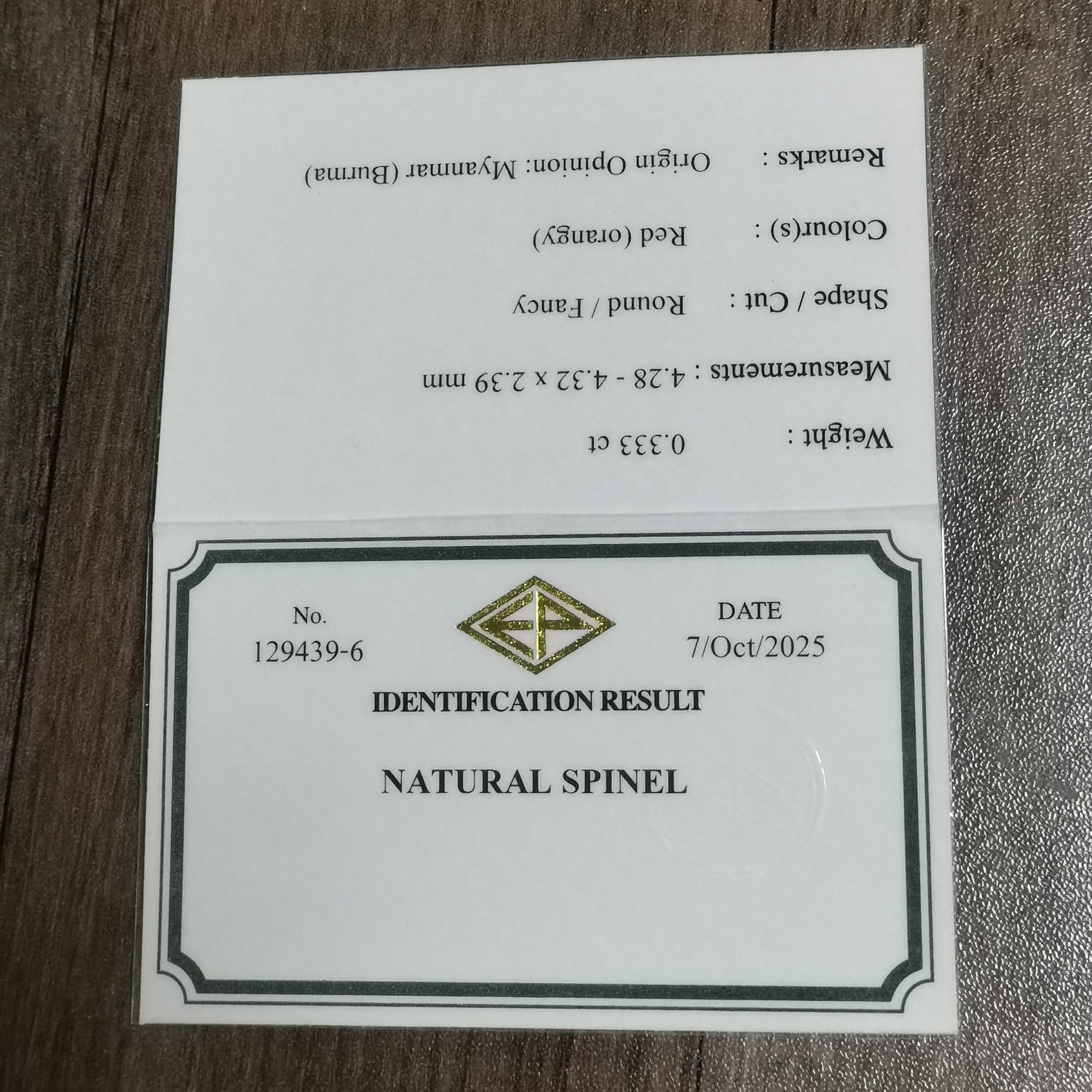 赤色を基調に、オレンジとピンキッシュな色調が溶け合う、ミャンマー産スピネル特有の彩度の高いオレンジレッド。