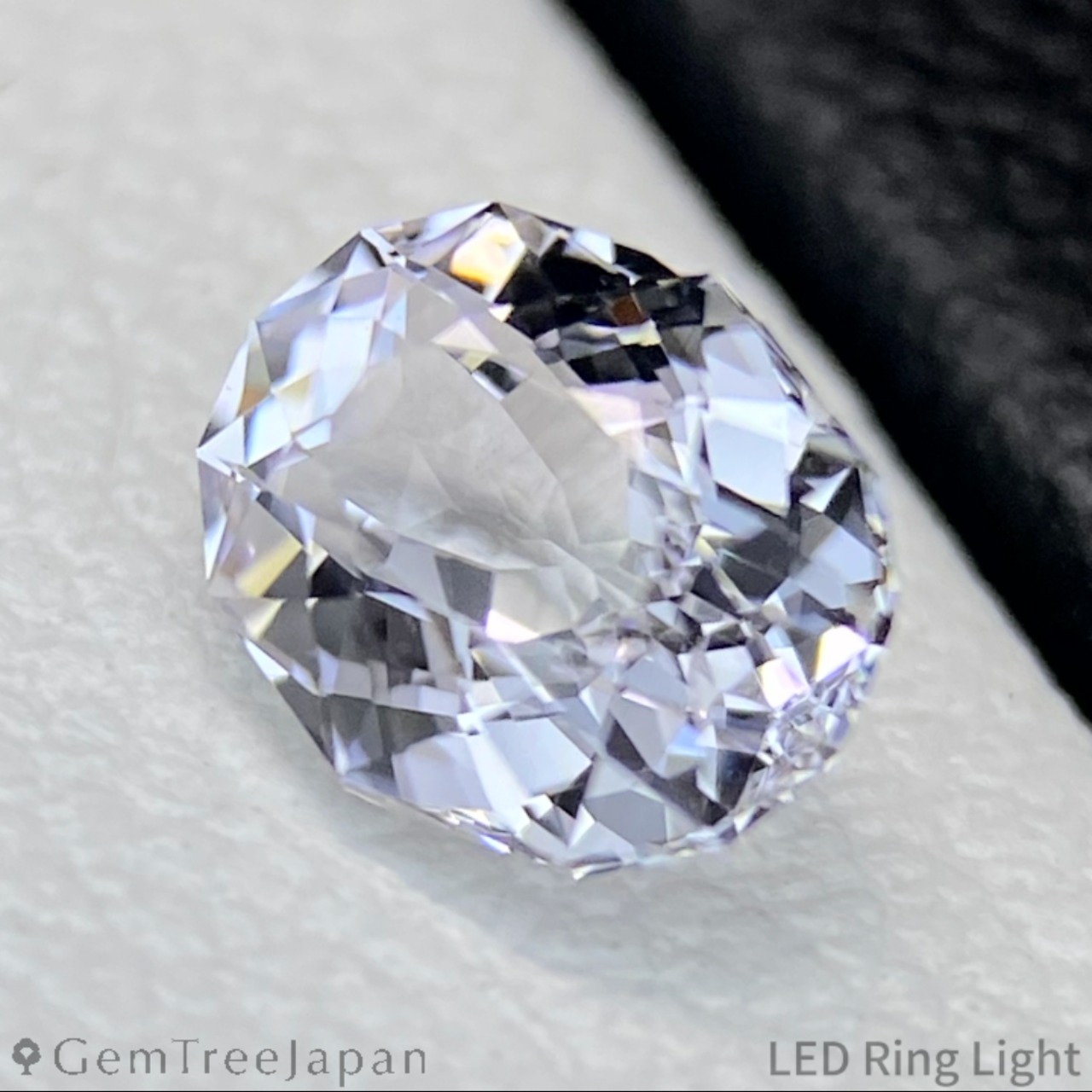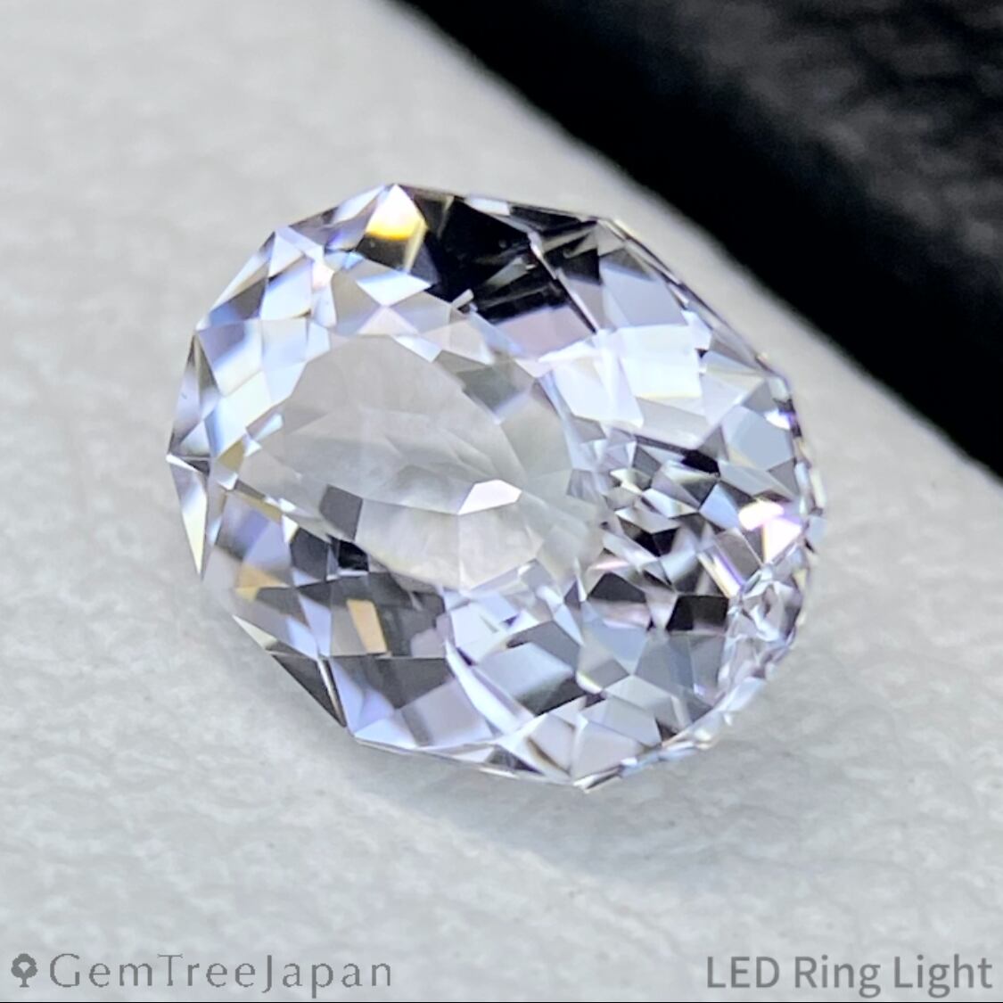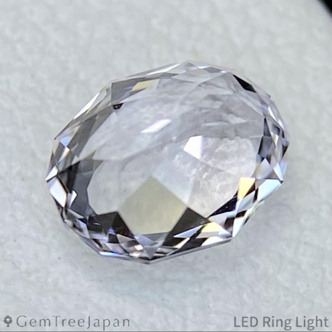 一口にカラーレスと言っても、わずかな色味を含む個体が多い中で、本石はホワイトの純度が非常に高く、ごく僅かにピンキッシュヴァイオレットを感じる程度の、カラーレススピネルとしてはなかなか精度の高い色合いを備えています。