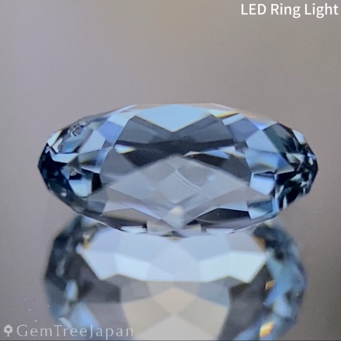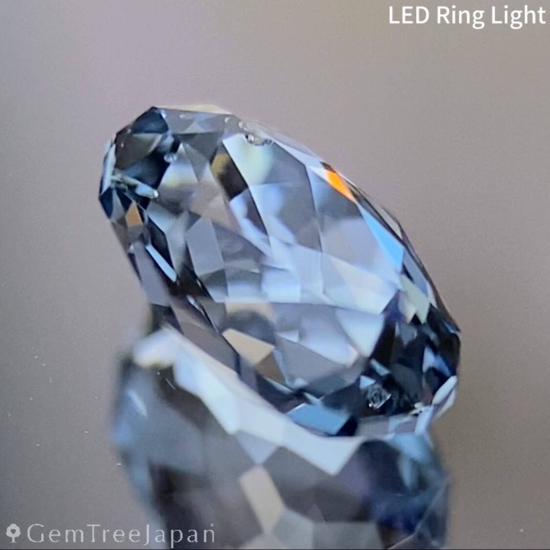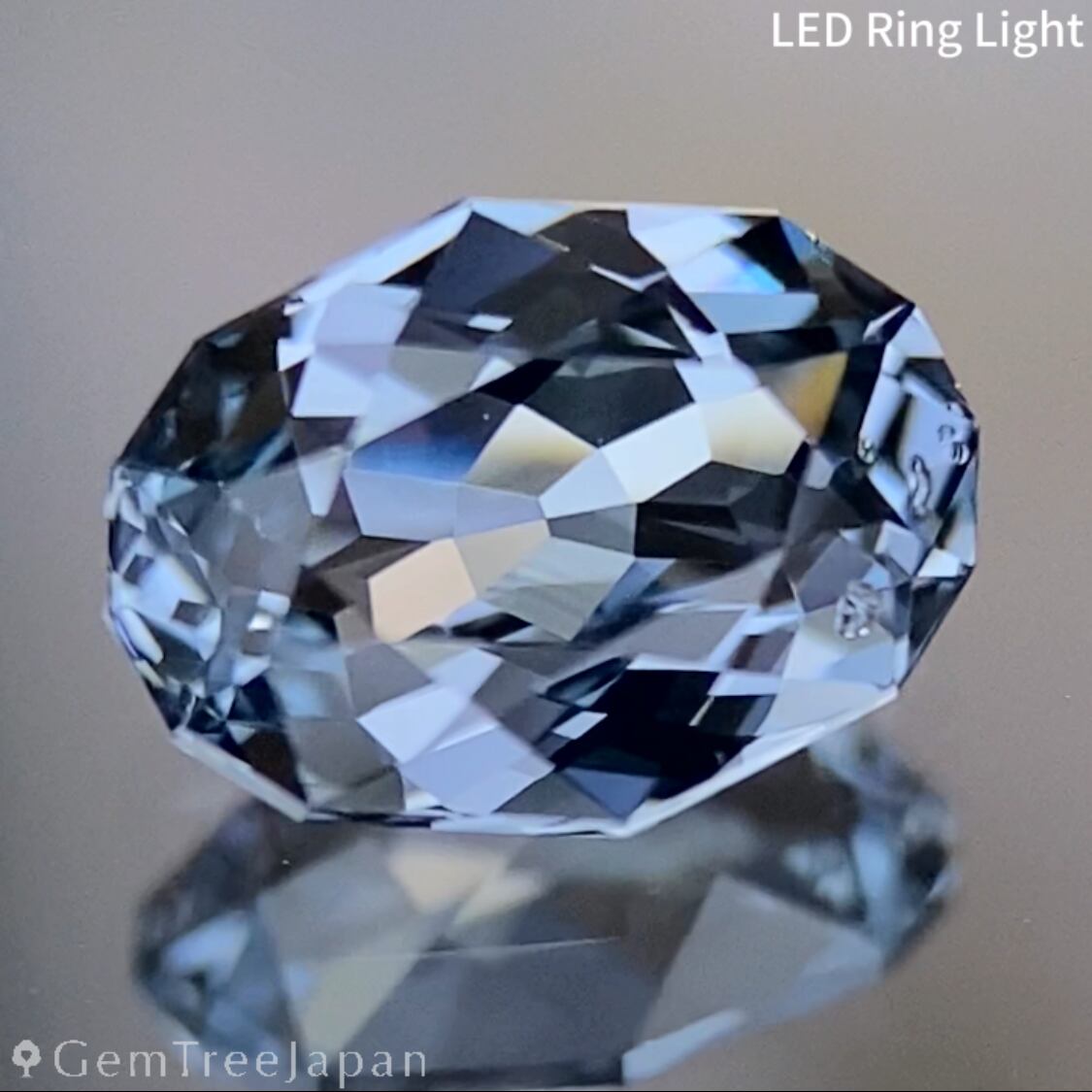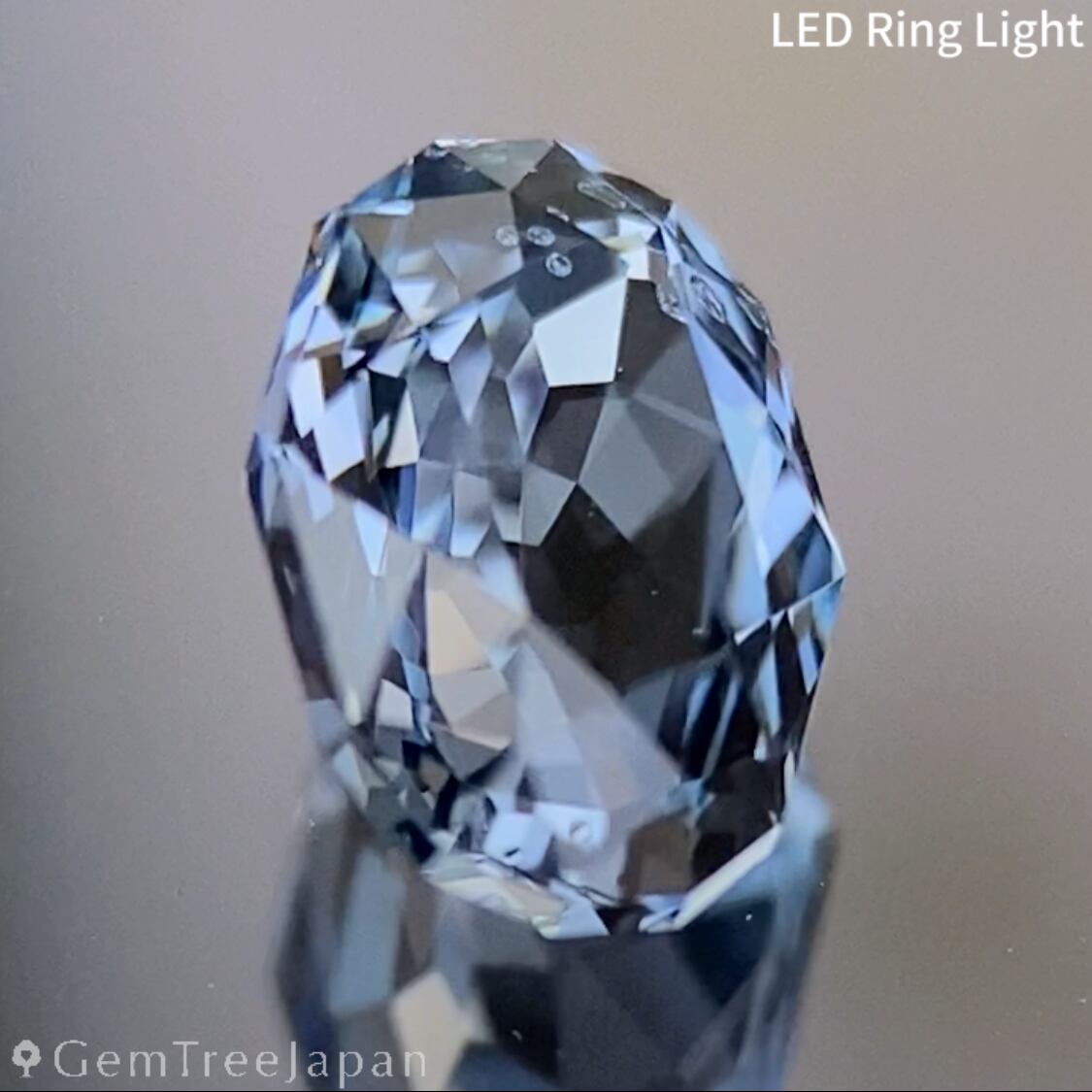 輪郭を細かく縁取ったファンシーオーバルに仕上げ、アイスグレーのキリッとした色合いの煌めきが溢れカラフルなファイアーとコバルトカラーの煌めきがチラつきます。