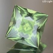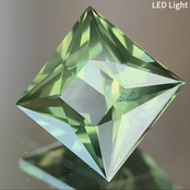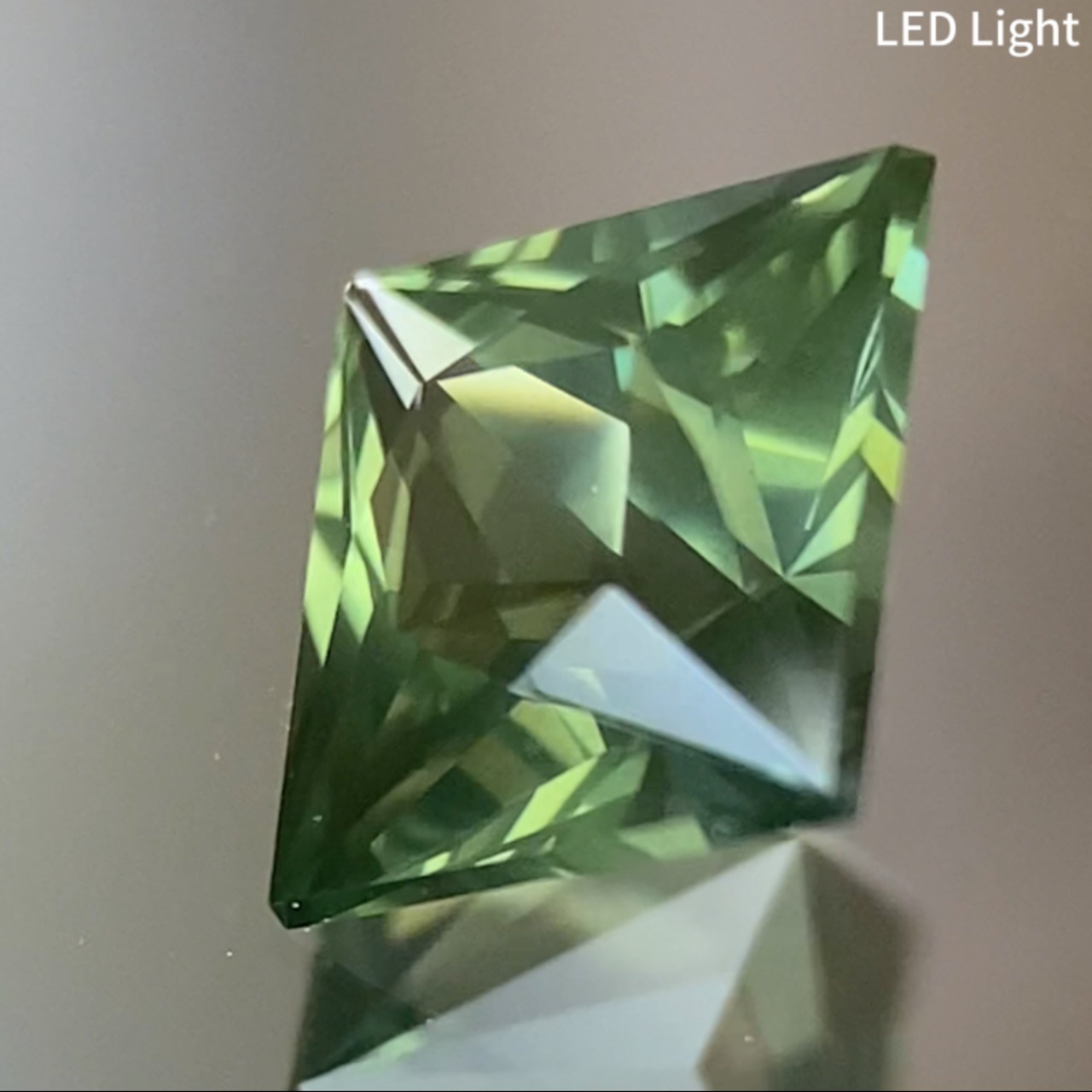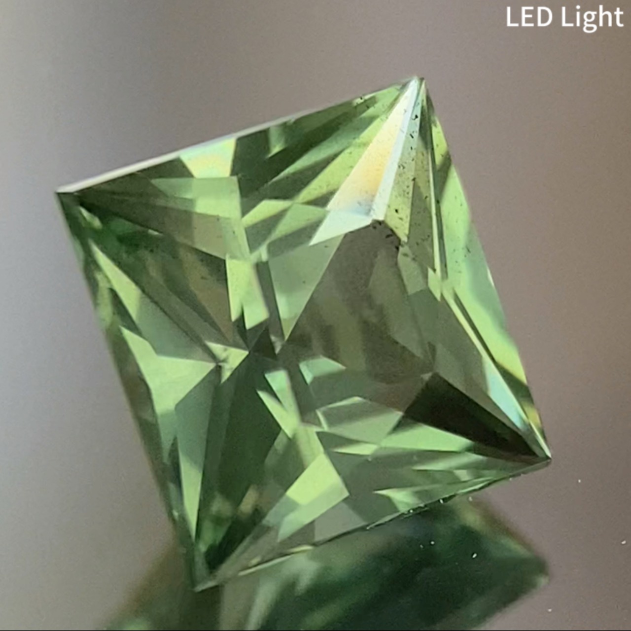 ゴールドのシルクが全体にひろがる軽く深みのあるグリーンのナイジェリア産の非加熱サファイアで、端正なプリンセスカットに仕上げた作品です。
