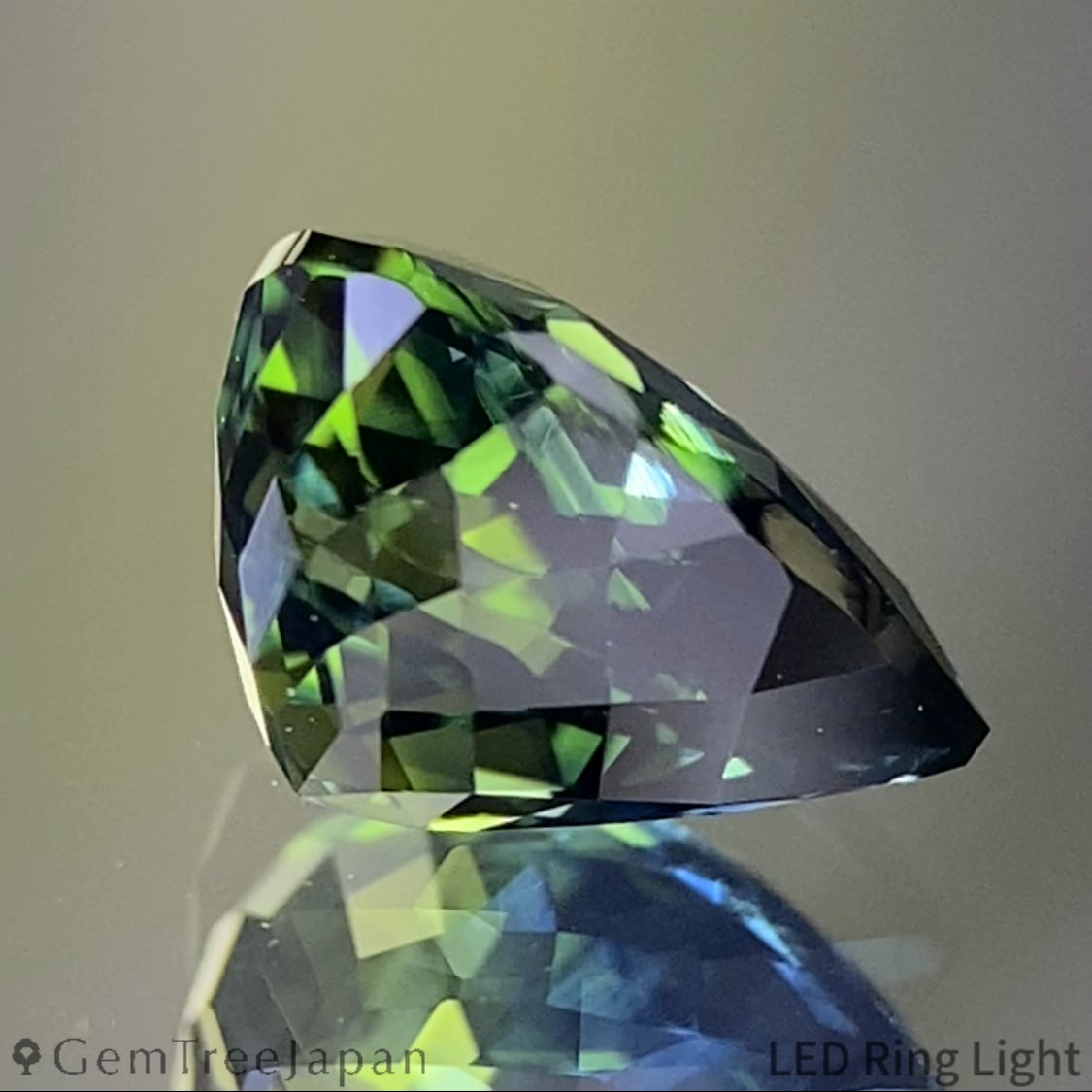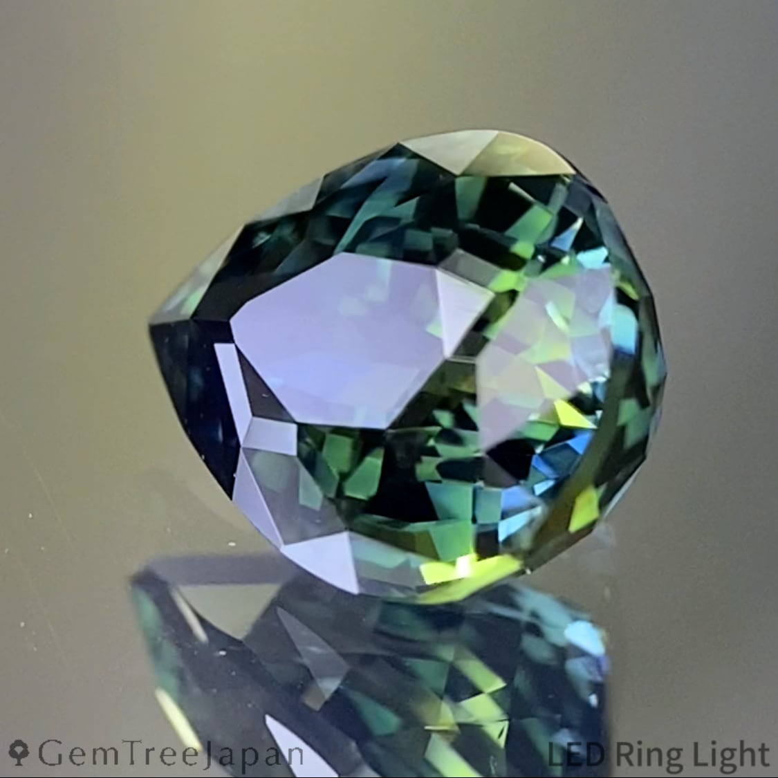 厚みのあるプロポーションの良い結晶で、イエローと深いブルーが複雑に溶け合い、イエロー・グリーン・ブルーの煌めきが交差する端正なペアシェイプに仕上げた作品です。