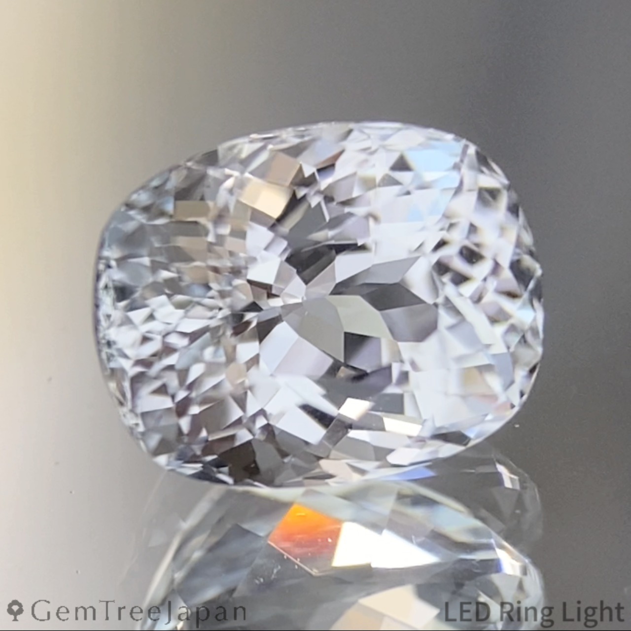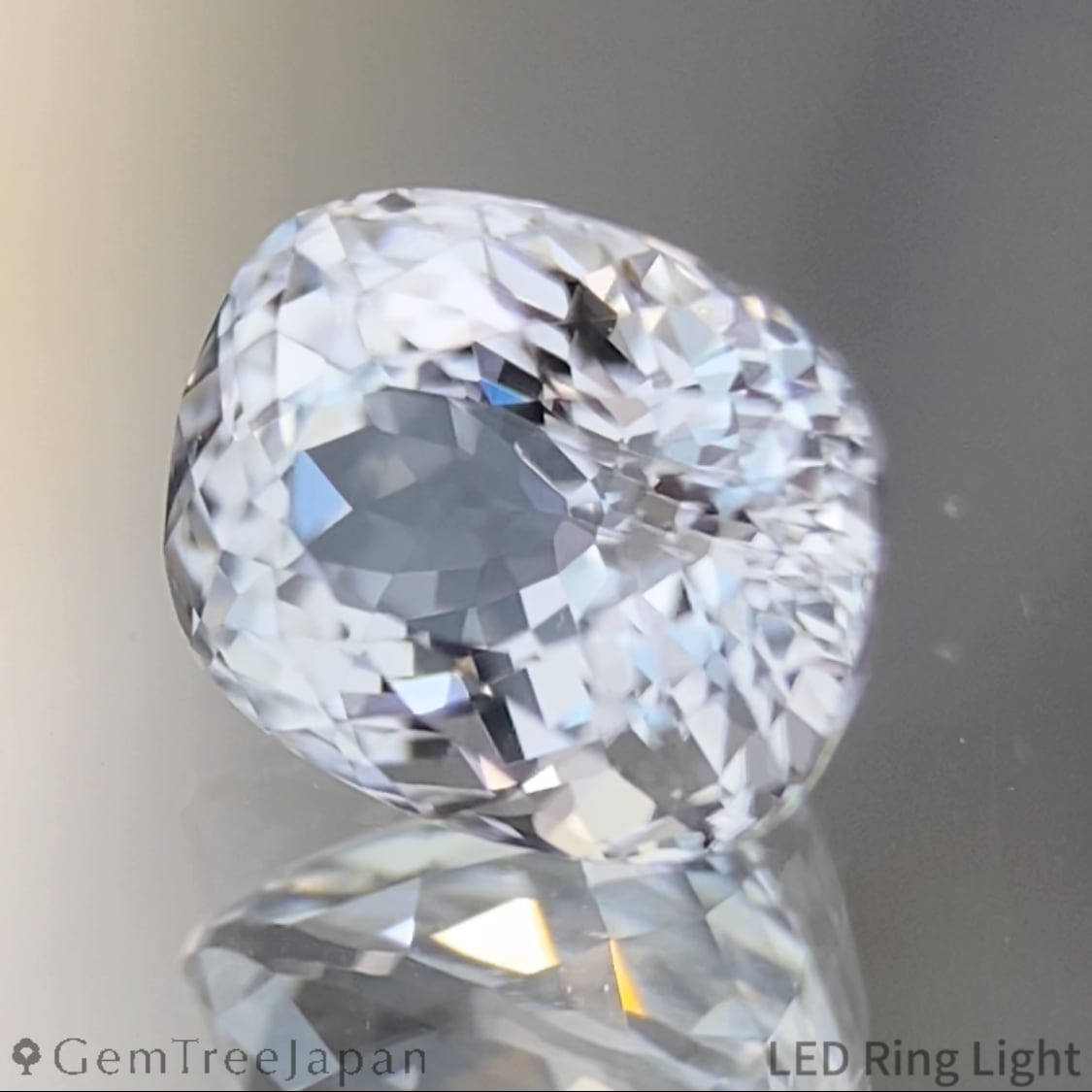 本作は、その中でも特に透明度に優れた無色の結晶で、1ctアップの存在感を活かしたクッションシェイプに仕上げられています。