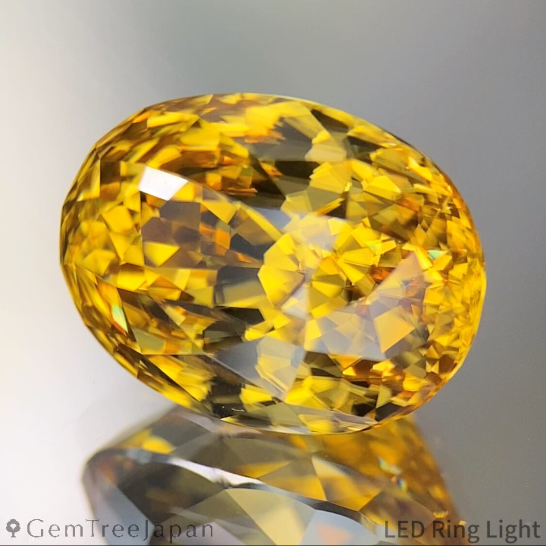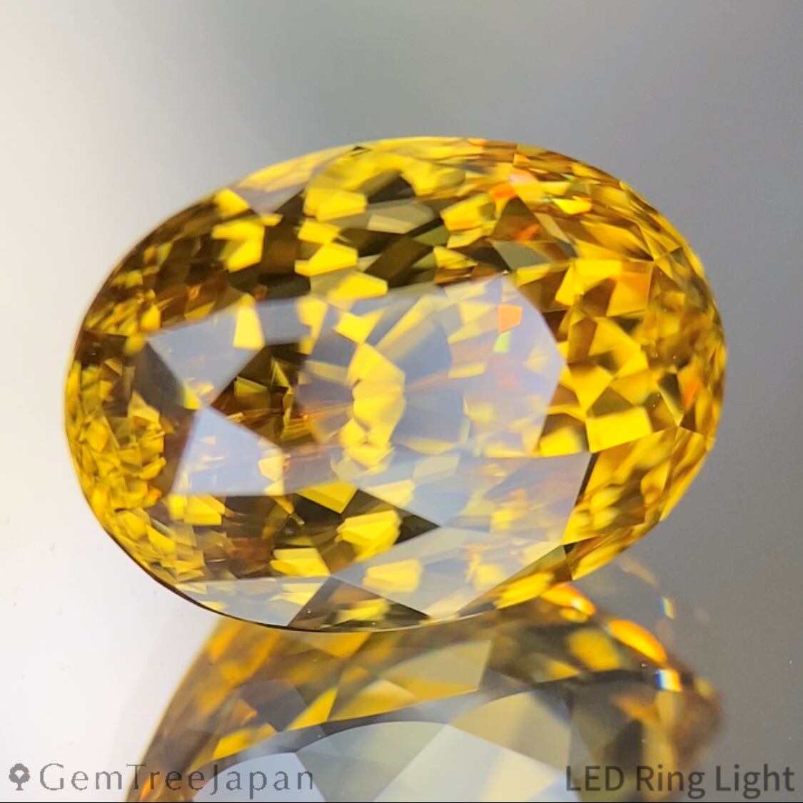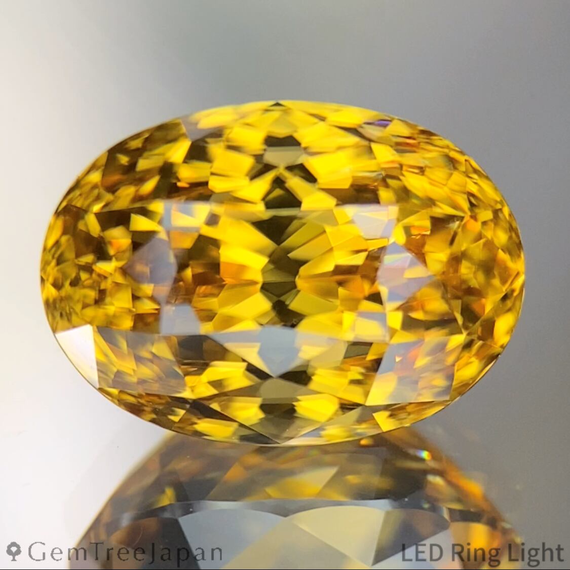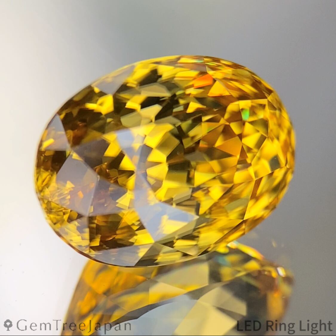 高い透明度を備えた美しい結晶に、オーバルシェイプいっぱいに細やかなファセットを敷き詰めることで、イエローゴールドのゴージャスな煌めきと、ジルコン特有の高い分散によるカラフルなファイアーが溢れ出します。