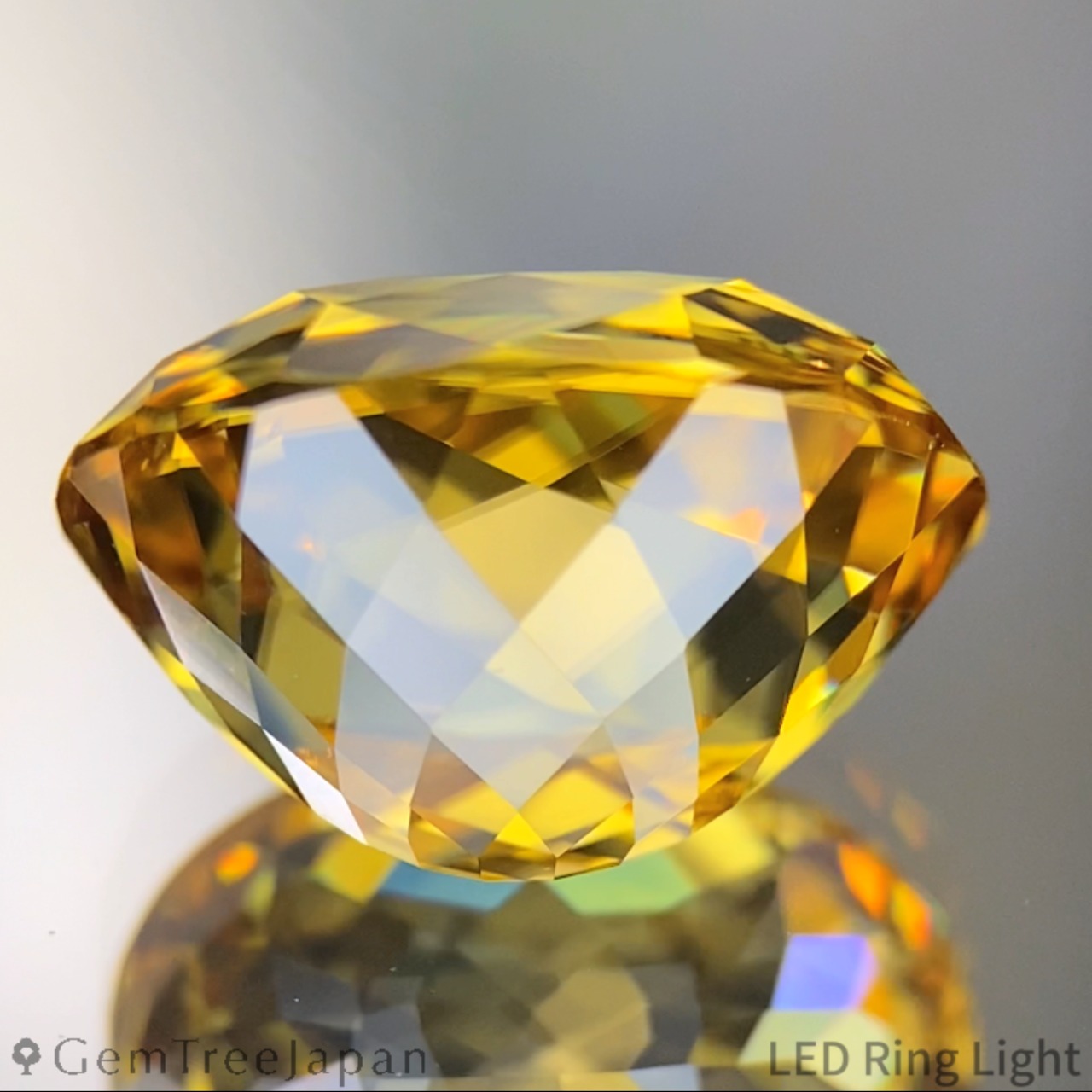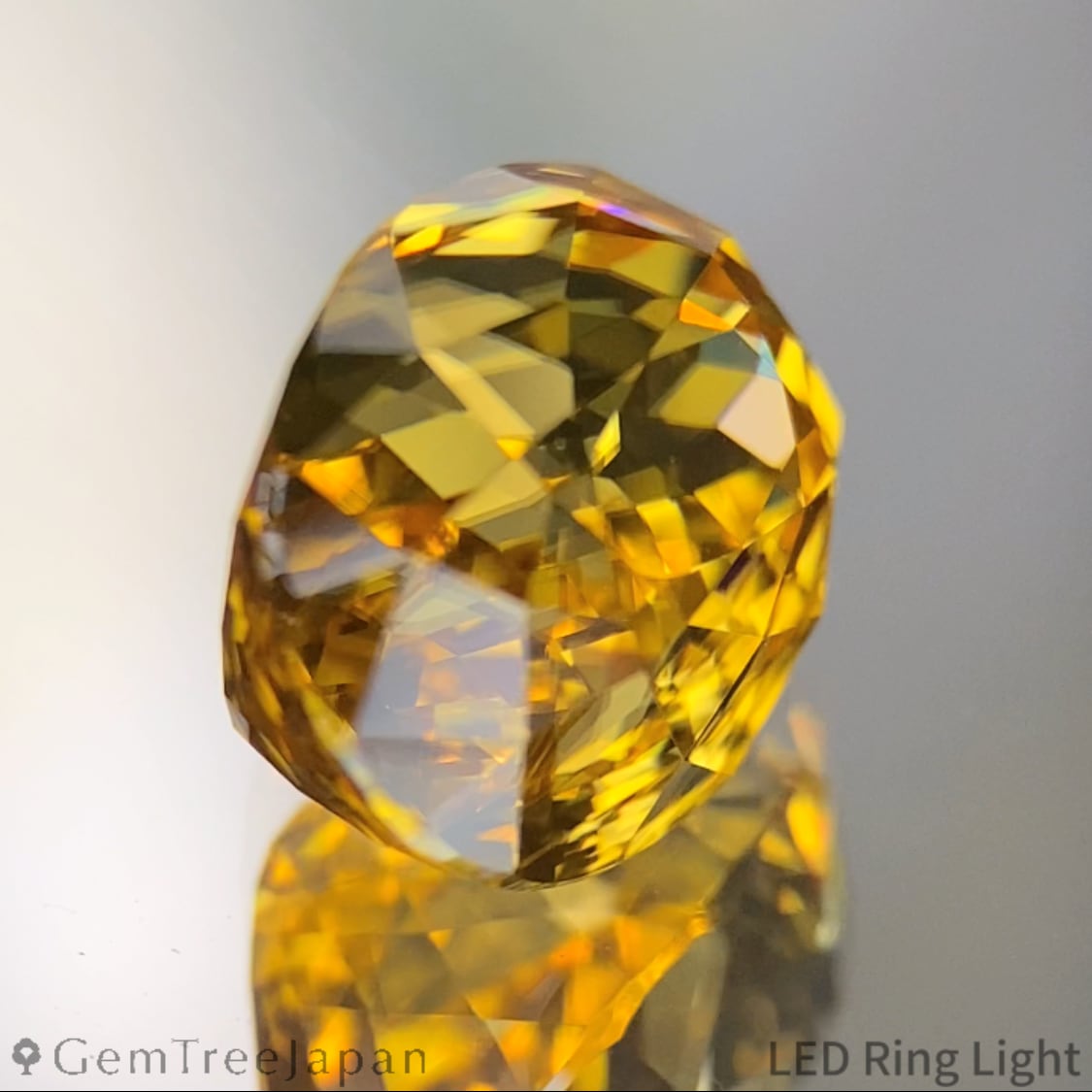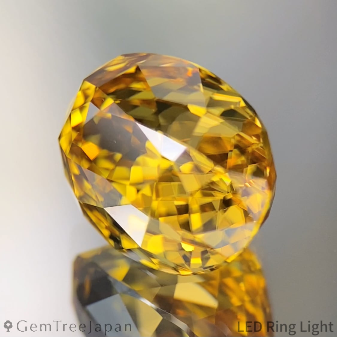 高い透明度を備えた美しい結晶に、オーバルシェイプいっぱいに細やかなファセットを敷き詰めることで、イエローゴールドのゴージャスな煌めきと、ジルコン特有の高い分散によるカラフルなファイアーが溢れ出します。
