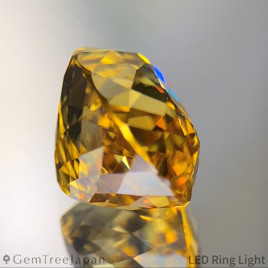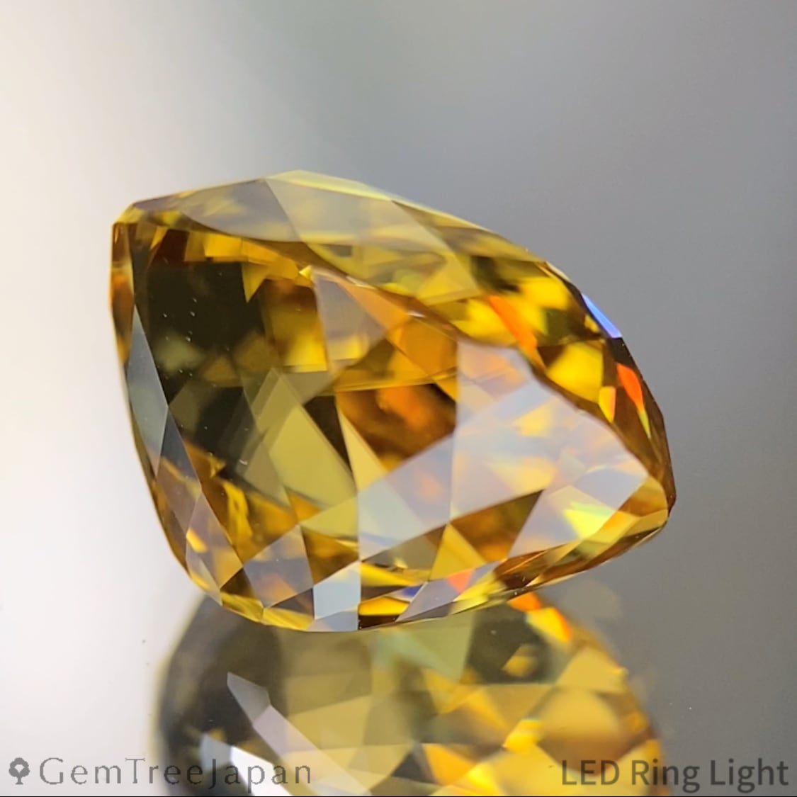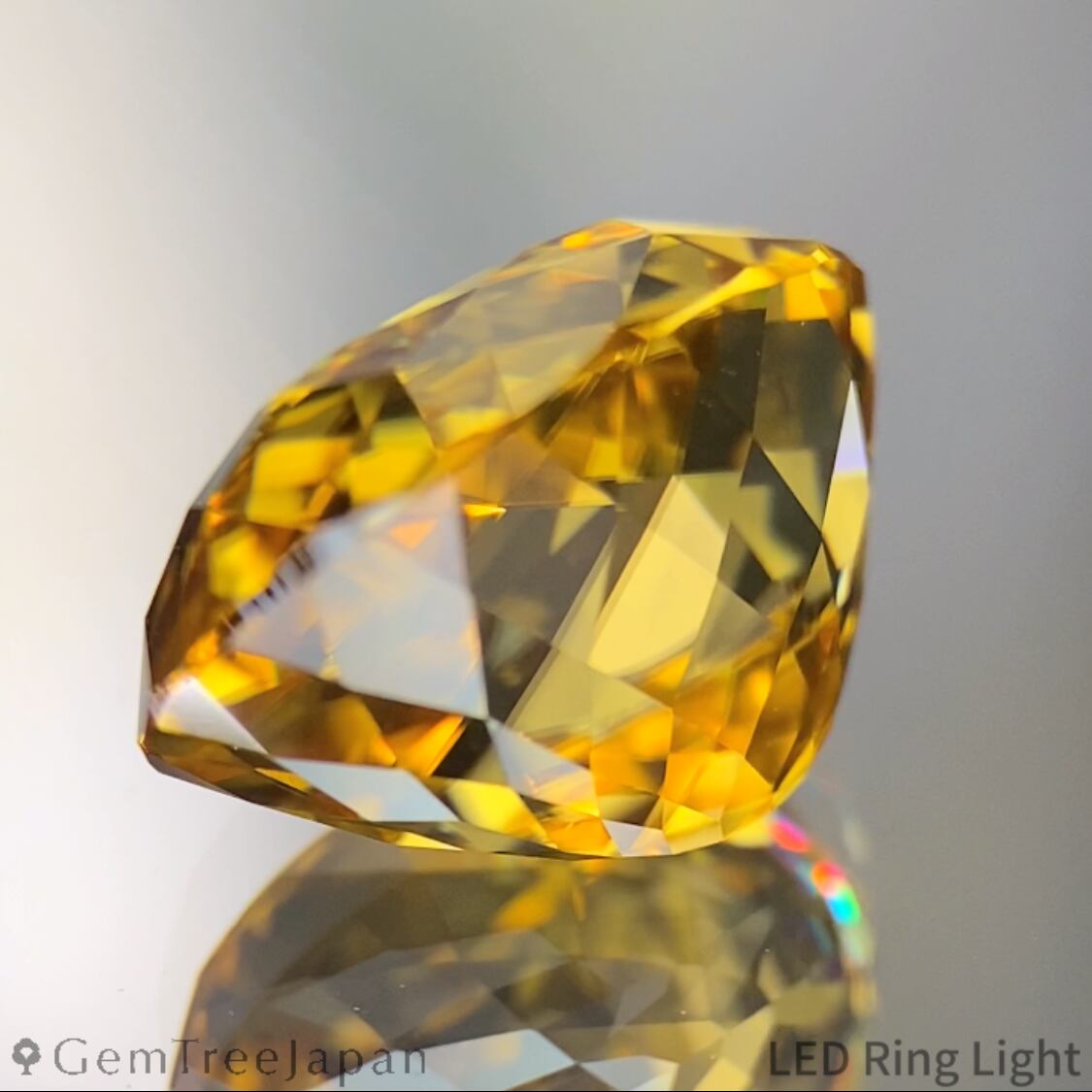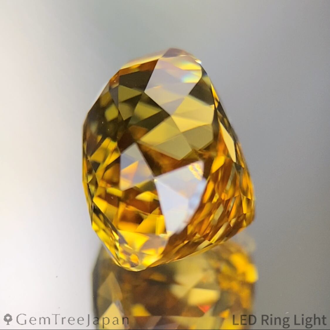 高い透明度を備えた美しい結晶に、オーバルシェイプいっぱいに細やかなファセットを敷き詰めることで、イエローゴールドのゴージャスな煌めきと、ジルコン特有の高い分散によるカラフルなファイアーが溢れ出します。