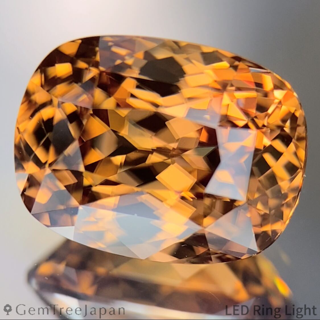 クッションシェイプいっぱいに構成された細やかなファセットが、ジルコン特有の高い分散を引き出し、内部からカラフルなファイアーが立体的に現れます。