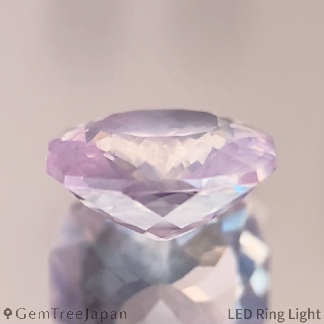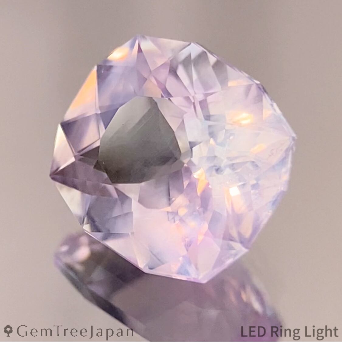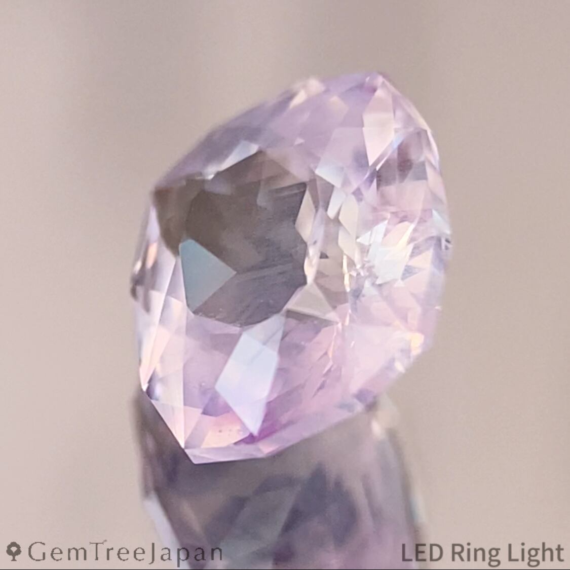 ルーペで覗くと、細く筋状に入ったシルクインクルージョンや、極小で透明な粒状の内包物が連なる様子が見られ、柔らかいカラーの中を流れる繊細なインクルージョンはファンタジックな作品の雰囲気によく合い美しいです。