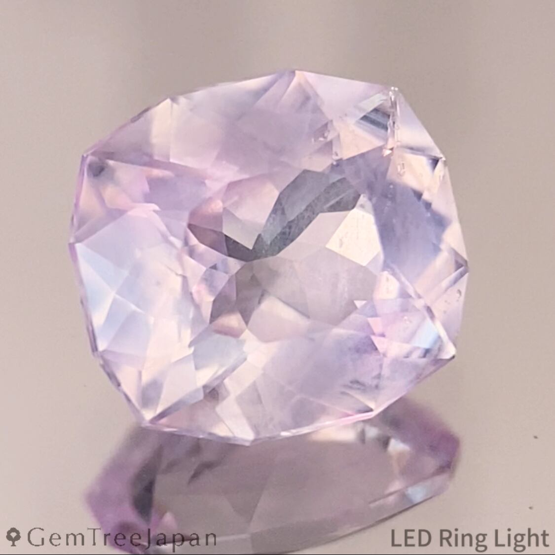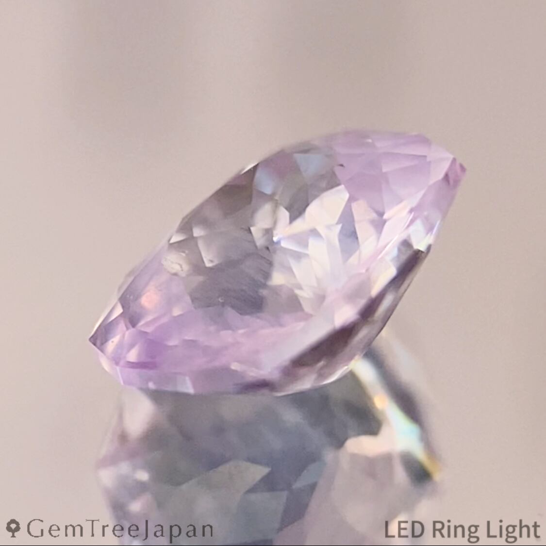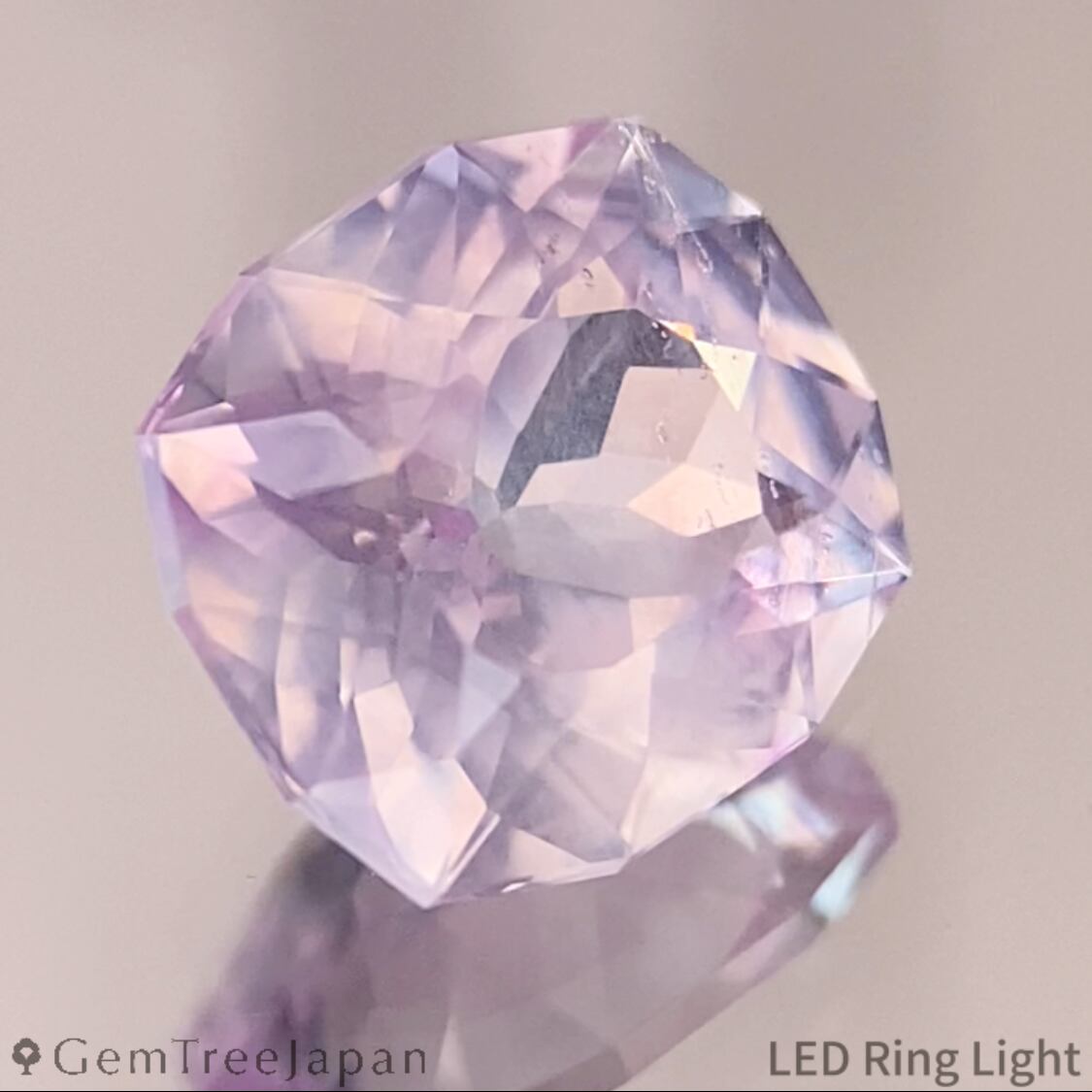 ルーペで覗くと、細く筋状に入ったシルクインクルージョンや、極小で透明な粒状の内包物が連なる様子が見られ、柔らかいカラーの中を流れる繊細なインクルージョンはファンタジックな作品の雰囲気によく合い美しいです。