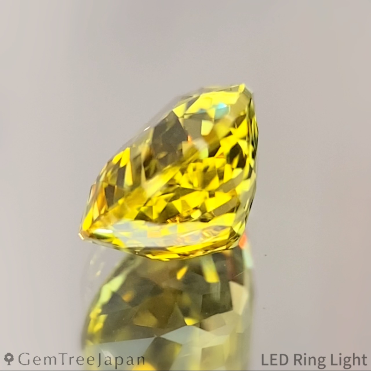 先端に溜まる濃いイエローからグリーニッシュイエローへの移り変わりやパーティ感が大きな魅力で、イエローとグリーンが織りなす絶妙な色合いがカンチャナブリー産らしさを感じられる作品です。