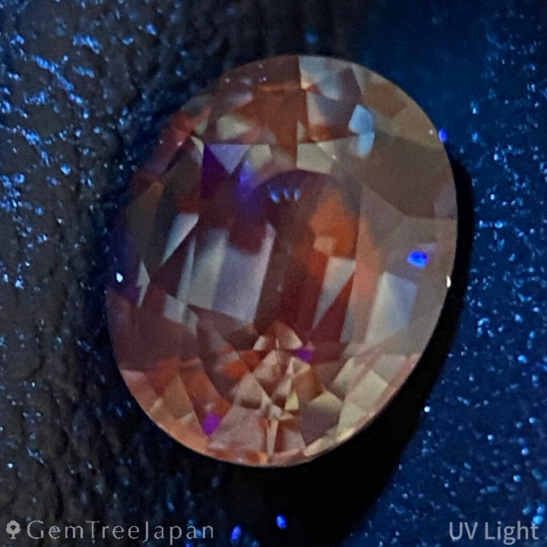 UVライトを当てると、イエローのゾーンがごくわずかにオレンジ寄りに蛍光し、日常光とは異なる表情を見せてくれるのも、この石ならではの楽しみのひとつ。
