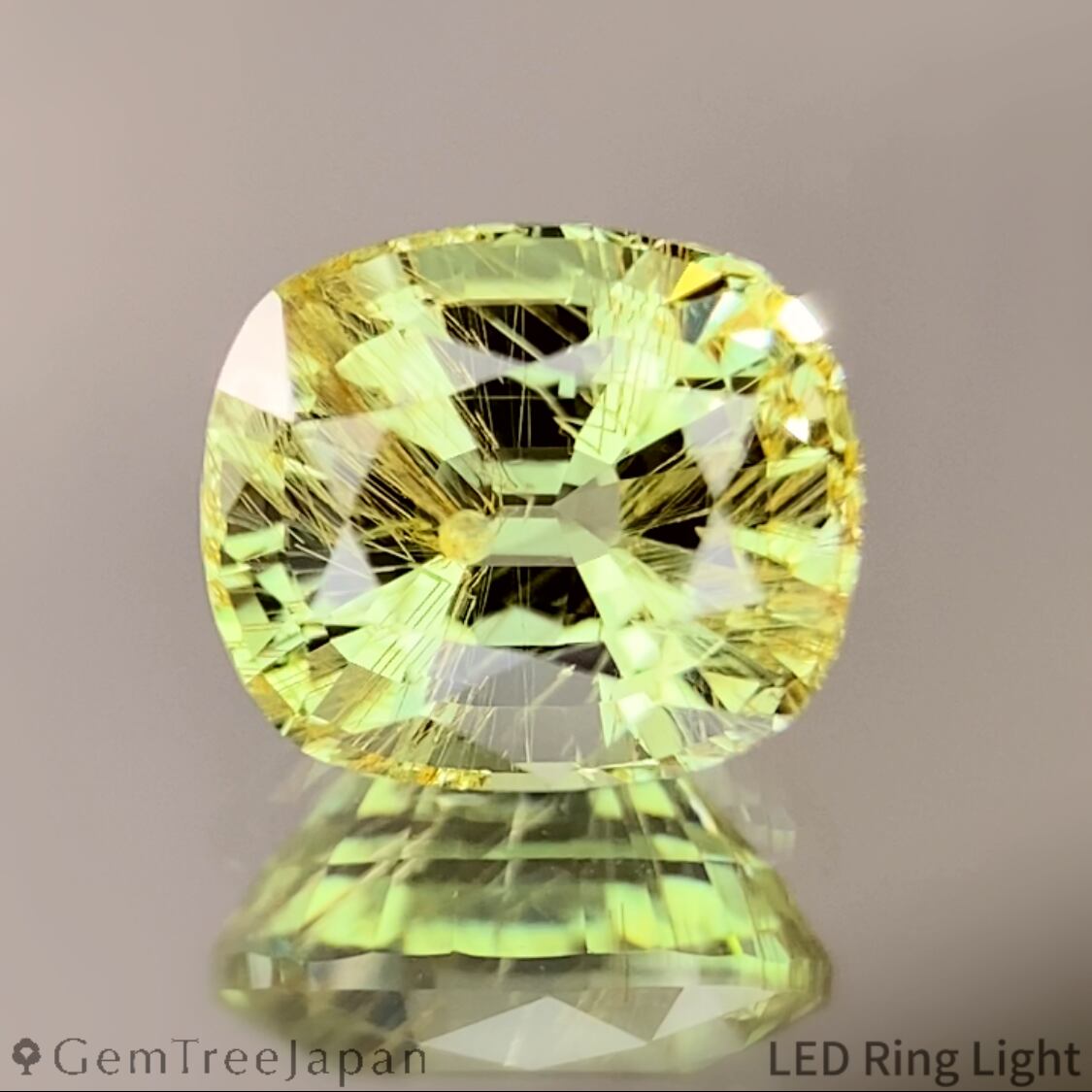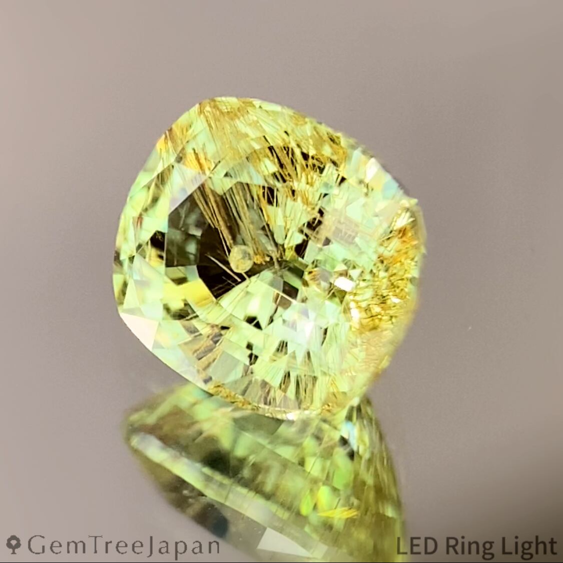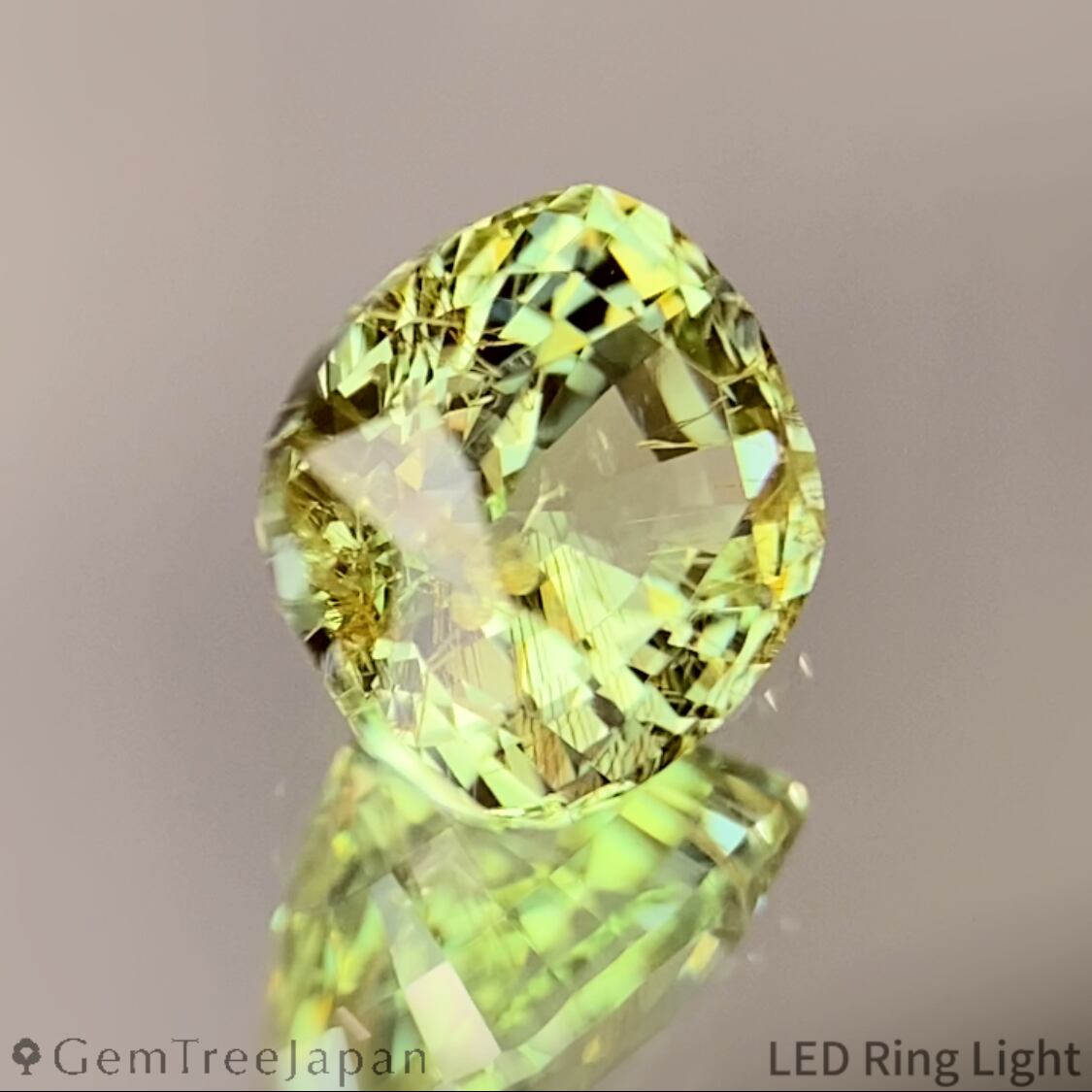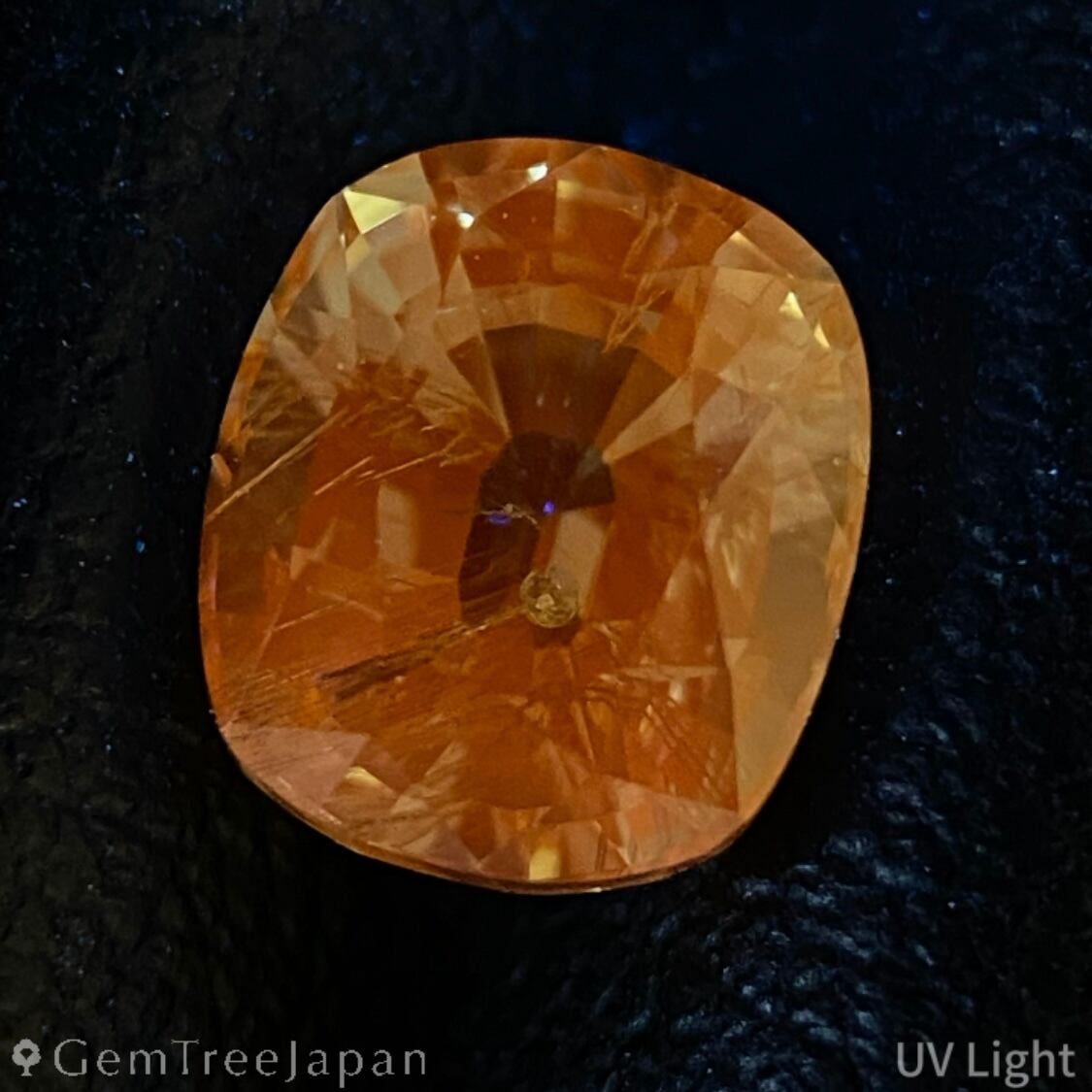 若草色の明るいタイプのタンザニア産ツァボライトで、UVライトを当てるとオレンジに蛍光する一石を、端正な正角のクッションに仕上げた作品です。
