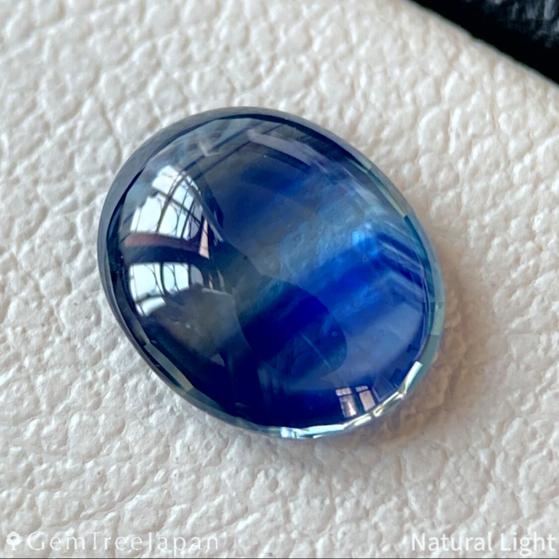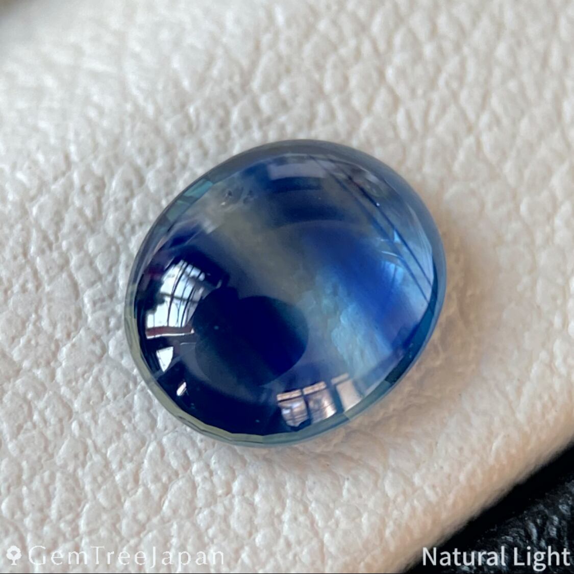 脇に半透明の筋状の内包物や、小さな白い結晶状の内包物がありますが、カボションカットの緩やかなカーブによる反射によって、肉眼では見つけるのが難しいレベルです。
