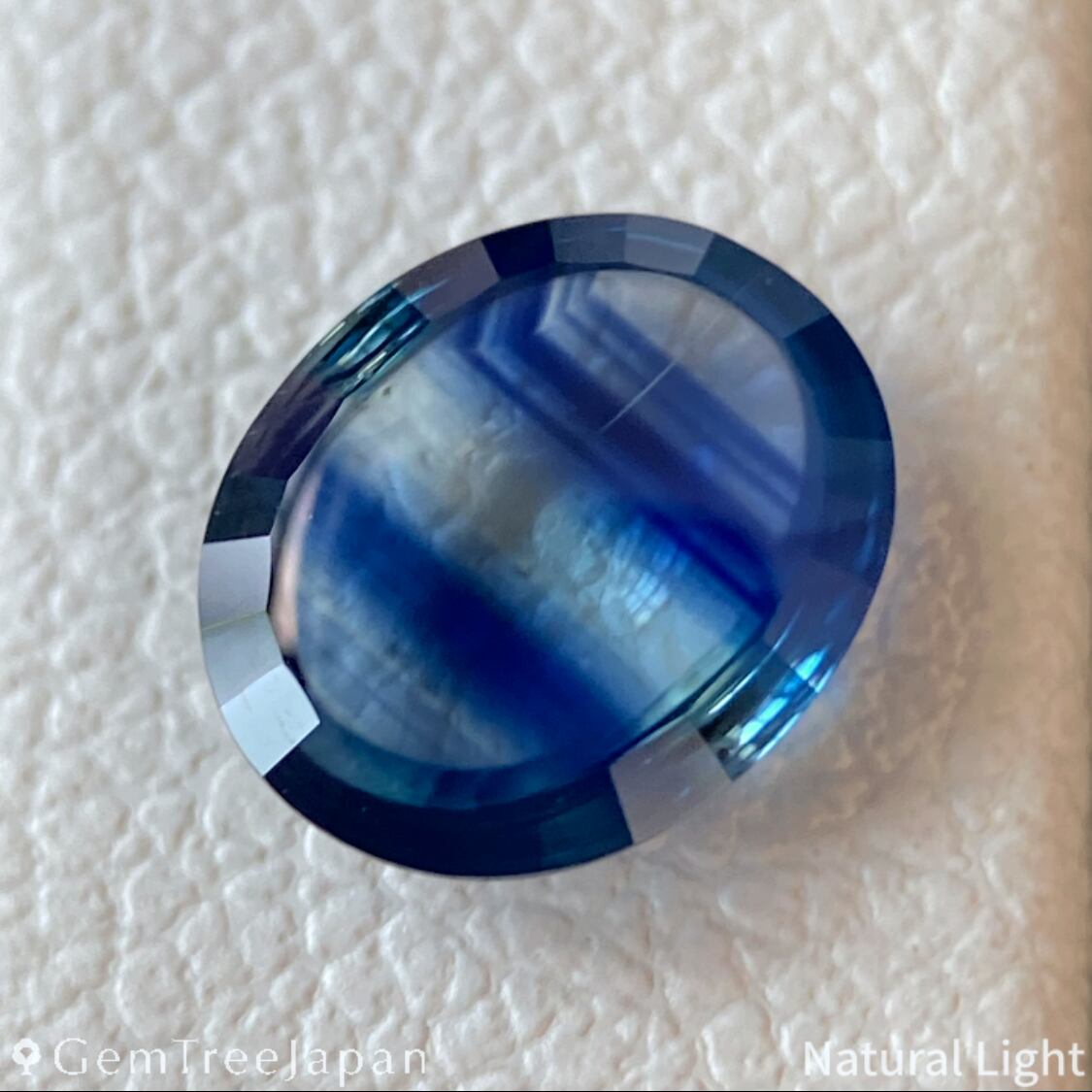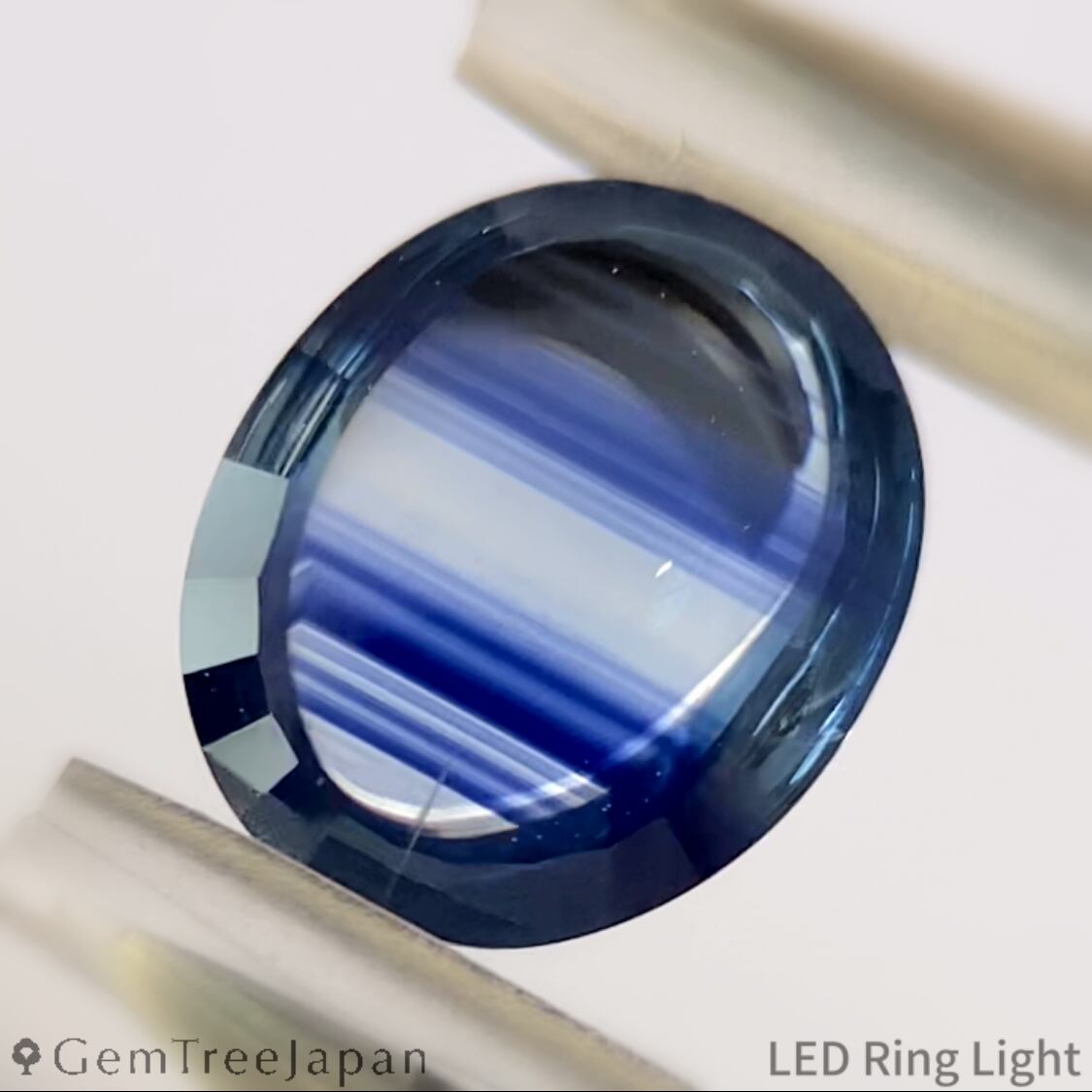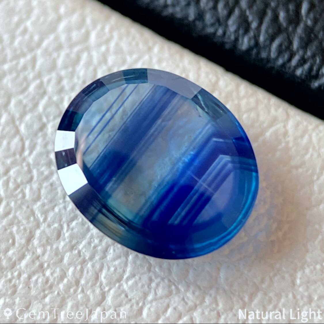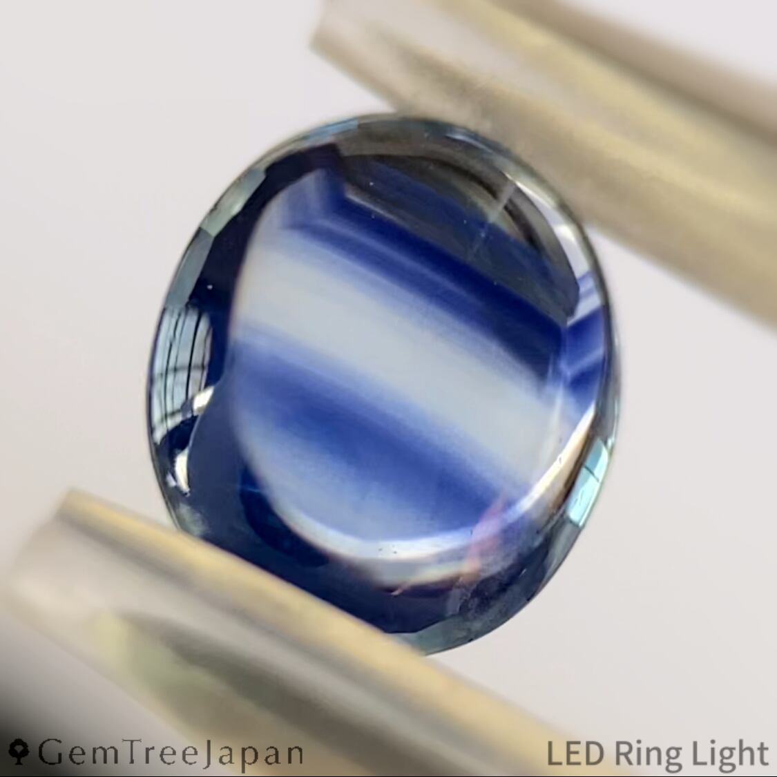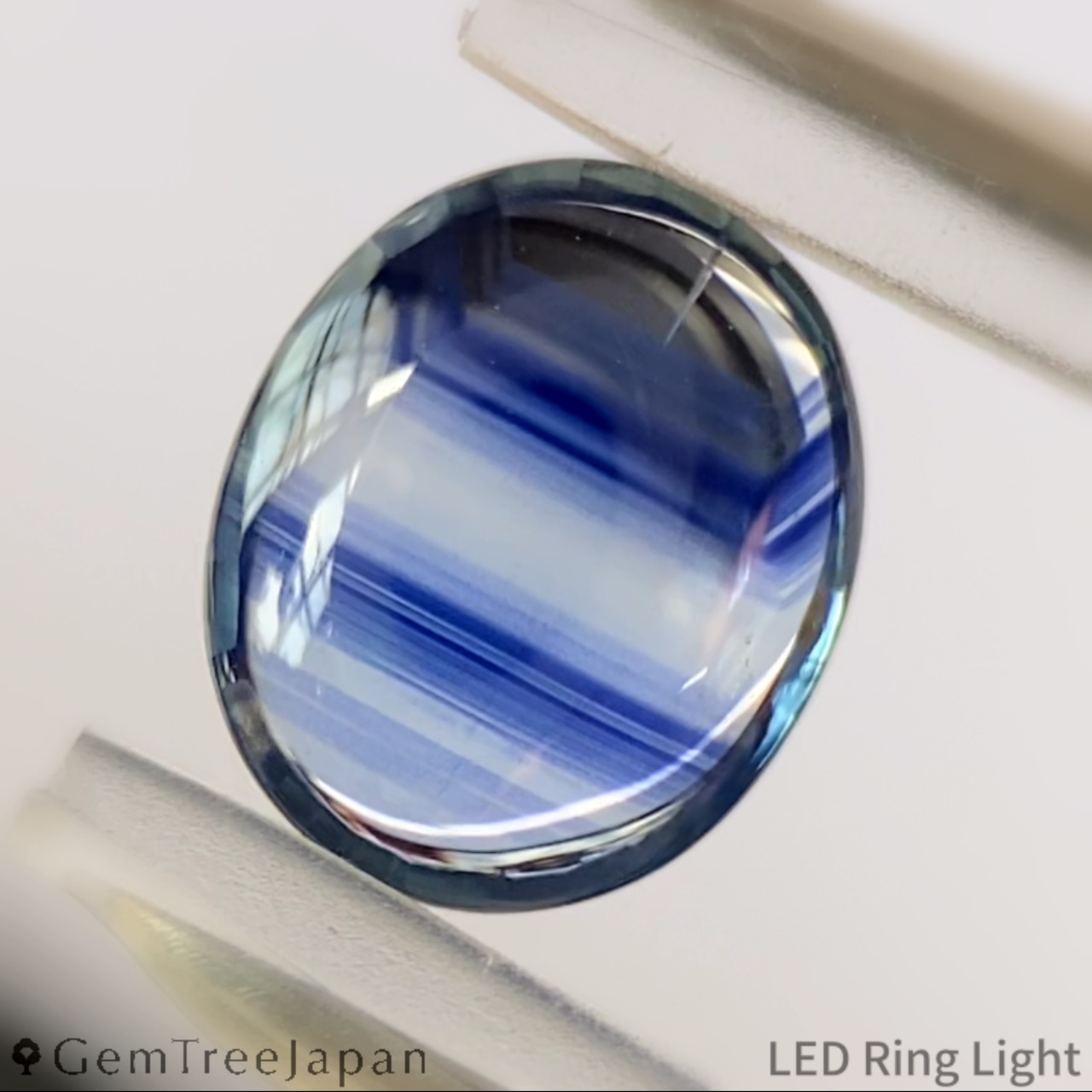 ほんの僅かにイエローを含んだニアカラーレスに、濃いブルーのカラーバンドが幾重にも走り、角度によっては部分的に鮮やかなブルーが広がります。