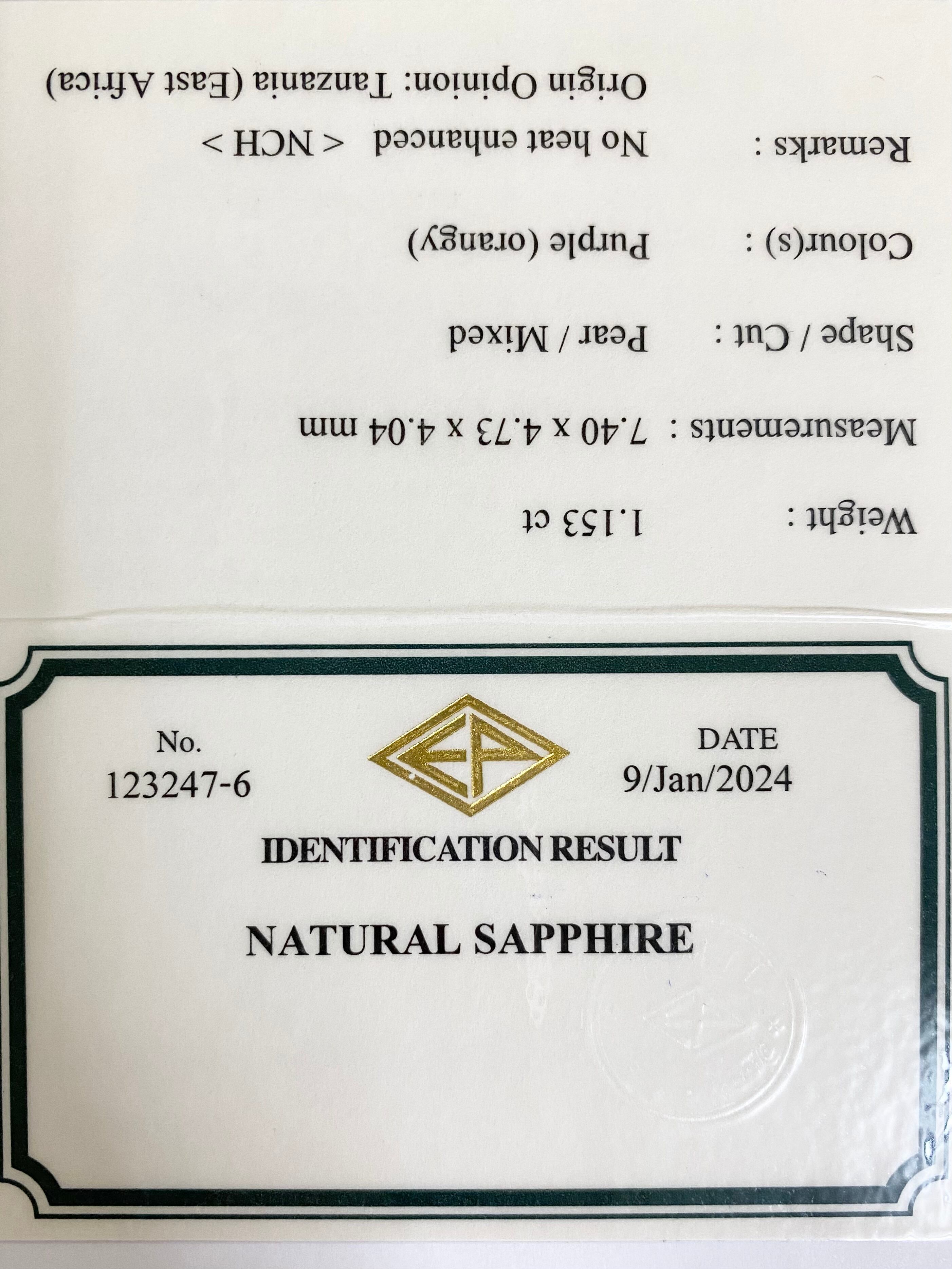 もう少しピンクが強ければパパラチァサファイアとしてご紹介する色合いで、赤・パープル・オレンジ・シェリーなどの色合いが混ざり合う希少な美色です。