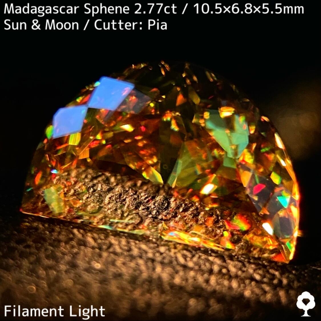 置き方によって印象が変わる作品で、斜めに置くとテーブル周りの細やかなファセット部分が三日月のように感じられるようにカットし、宝石らしい煌めきとスフェーンならではのカラフルなファイアーも最大限に引き出されています。