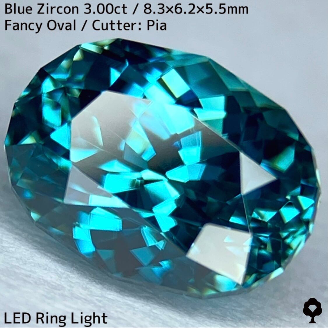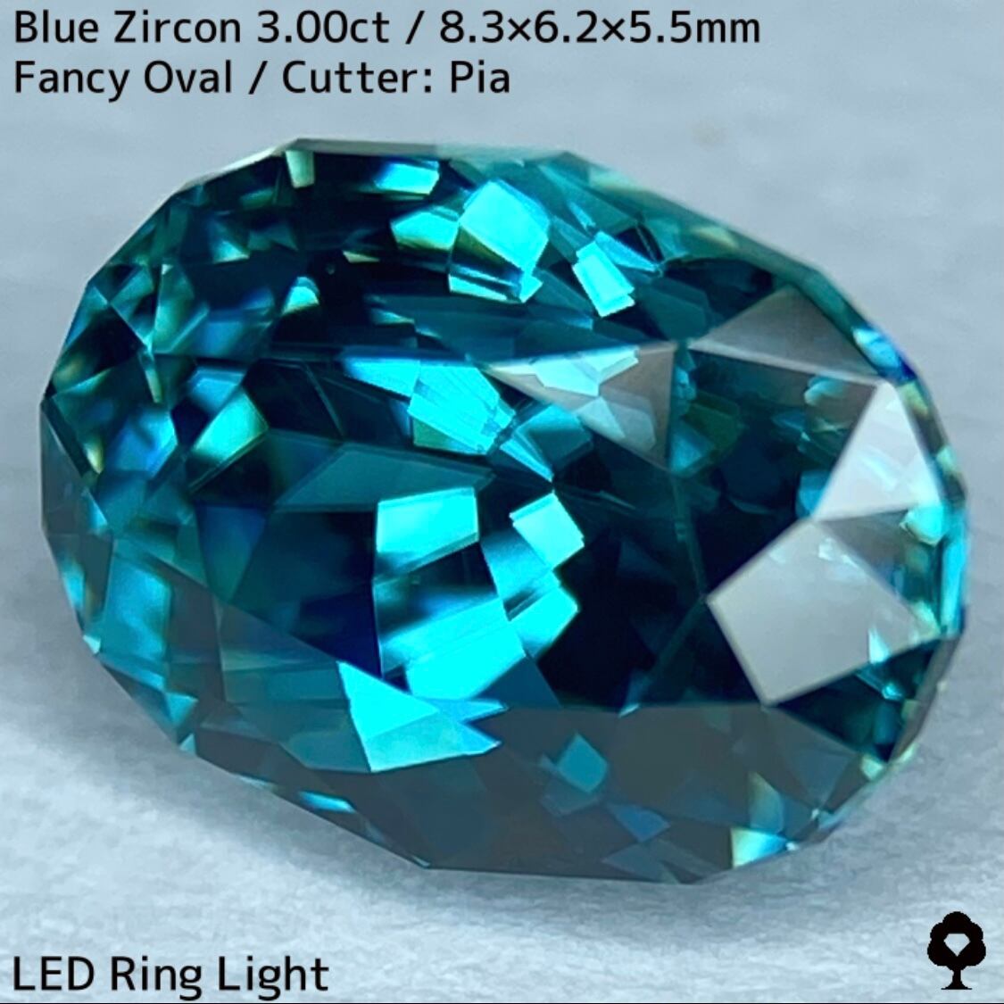 抜群の透明度と内包物の無い美結晶で、色のりも濃厚で彩度の高いグリニッシュブルーには、分散度の高いジルコンならではのカラフルなファイアーが彩られます。