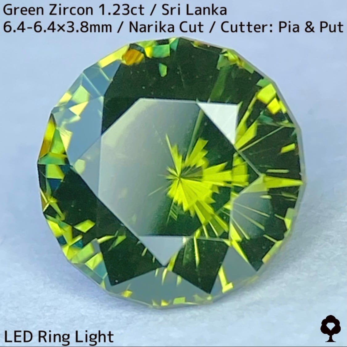 そもそも研磨の難しさからキレイなカットの少ないグリーンジルコンを難易度の高い抜群のカットに仕上げ、分散度の高いジルコンならではのカラフルなファイアーも煌めくなど、ポテンシャルを最大限に引き出しています。